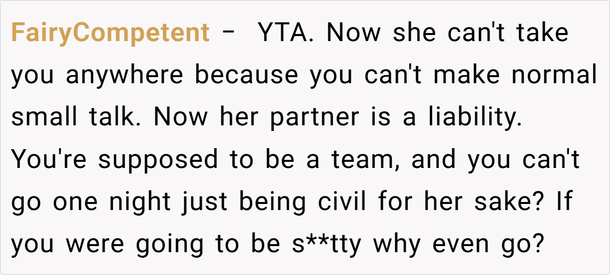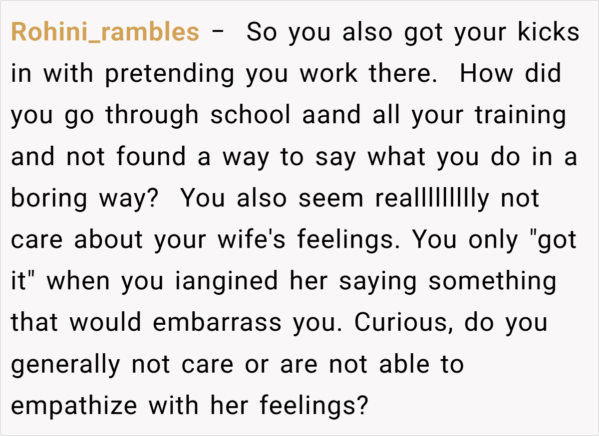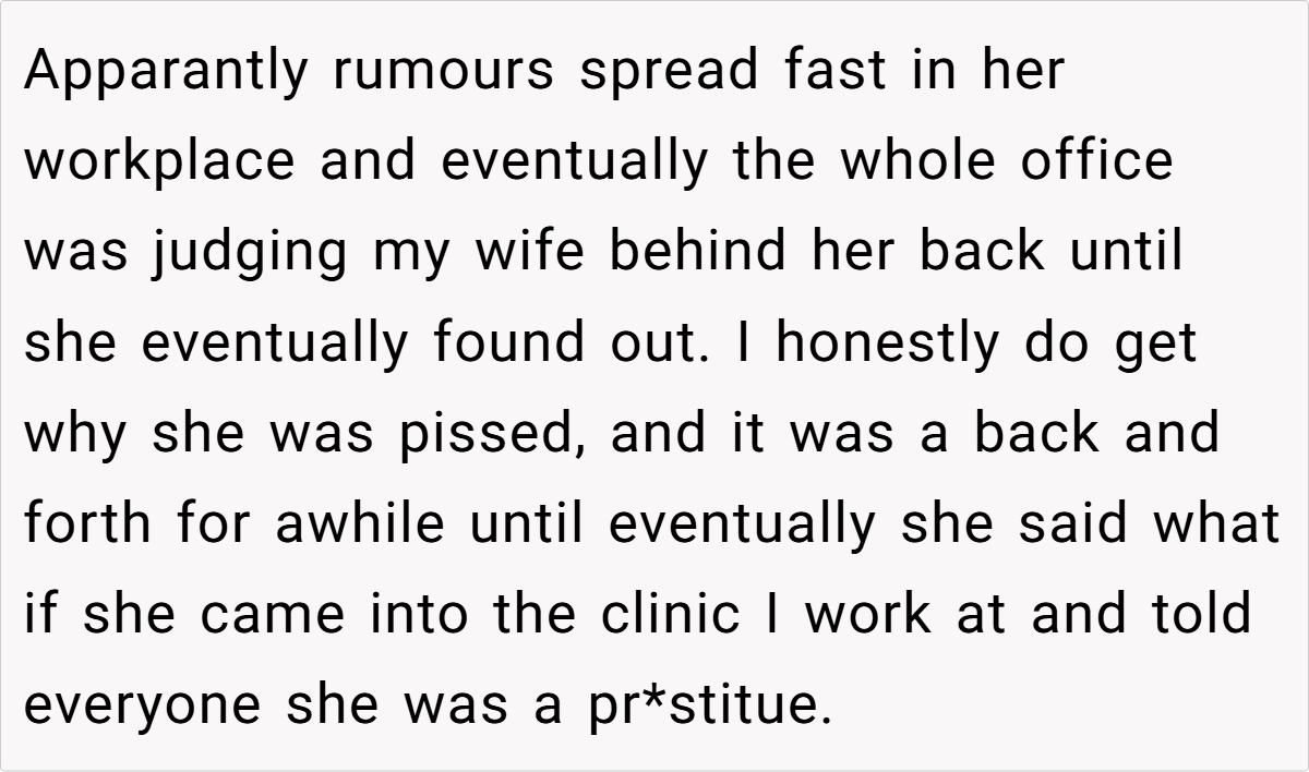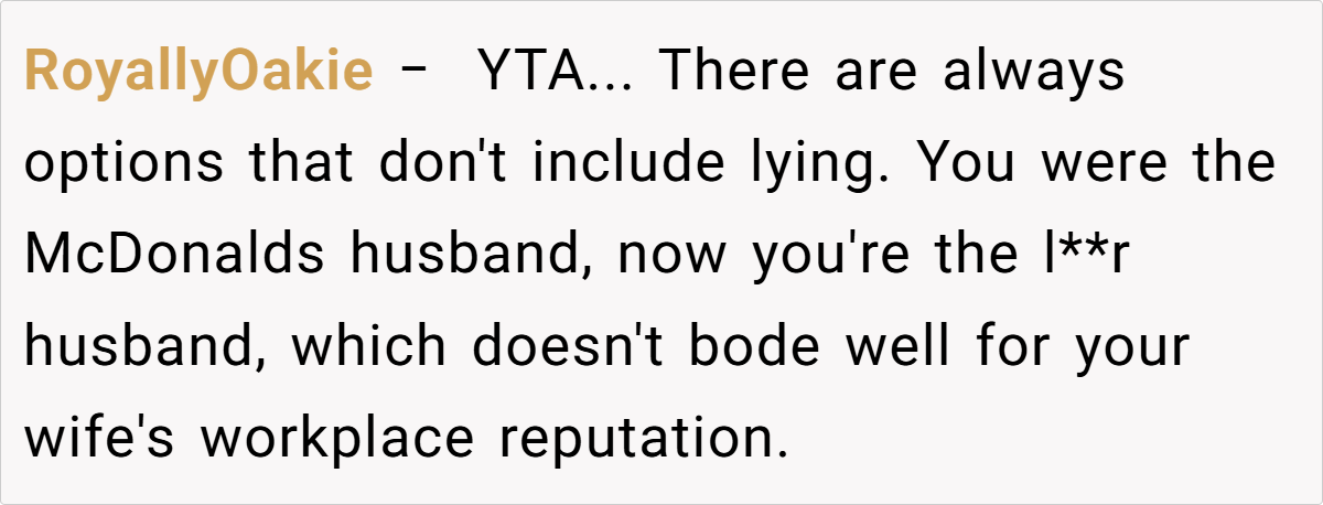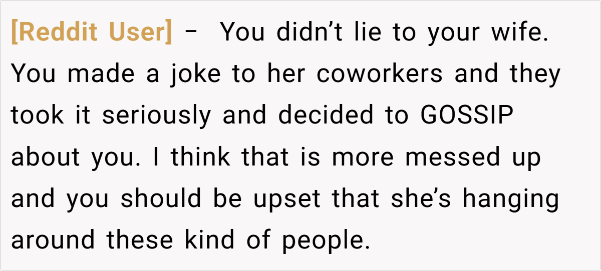 The Reddit community remains split on this issue. Some commenters applaud the husband for his quick wit and see his lie as an attempt to keep the mood light, arguing that his wife’s overreaction might be more about personal insecurity than the lie itself. Others criticize him for allowing a joke to evolve into a rumor that negatively affected his wife’s reputation at work.