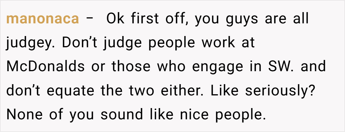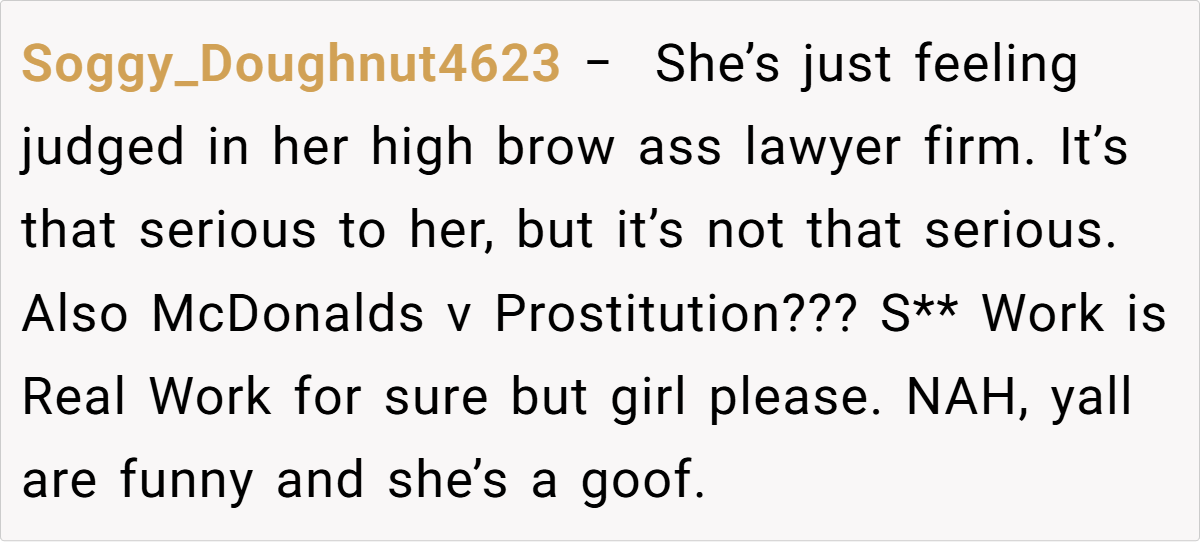 In a professional setting, such misrepresentations not only reflect poorly on the individual but can also have collateral effects on their partner’s social standing.” Dr. Carter adds that humor is a double-edged sword: “Humor can defuse tension, but if the joke backfires, it becomes a source of conflict. Here, the lie about working at McDonald’s, although intended as a witty retort, inadvertently spread through the workplace and embarrassed the wife.”