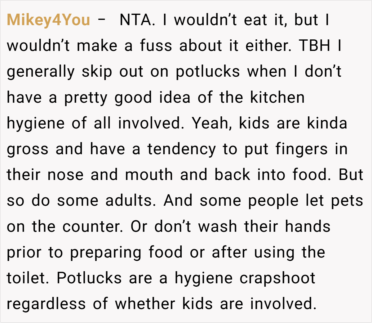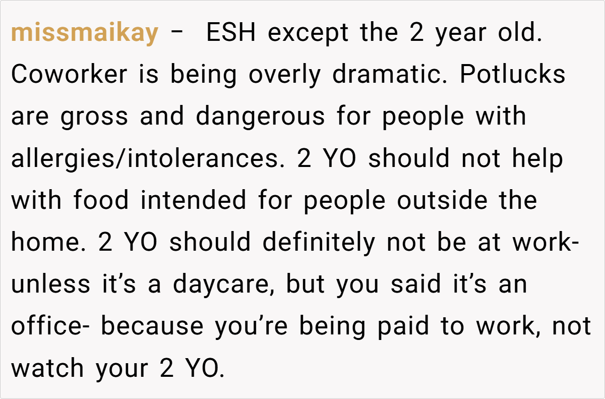 Many argue that a simple sign noting a toddler’s involvement is a sufficient disclaimer, and they view the co-worker’s reaction as an overreaction driven by personal bias. Some commenters appreciate the family-friendly vibe, suggesting that a relaxed potluck environment doesn’t require strict food hygiene standards.