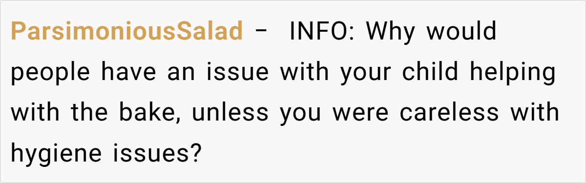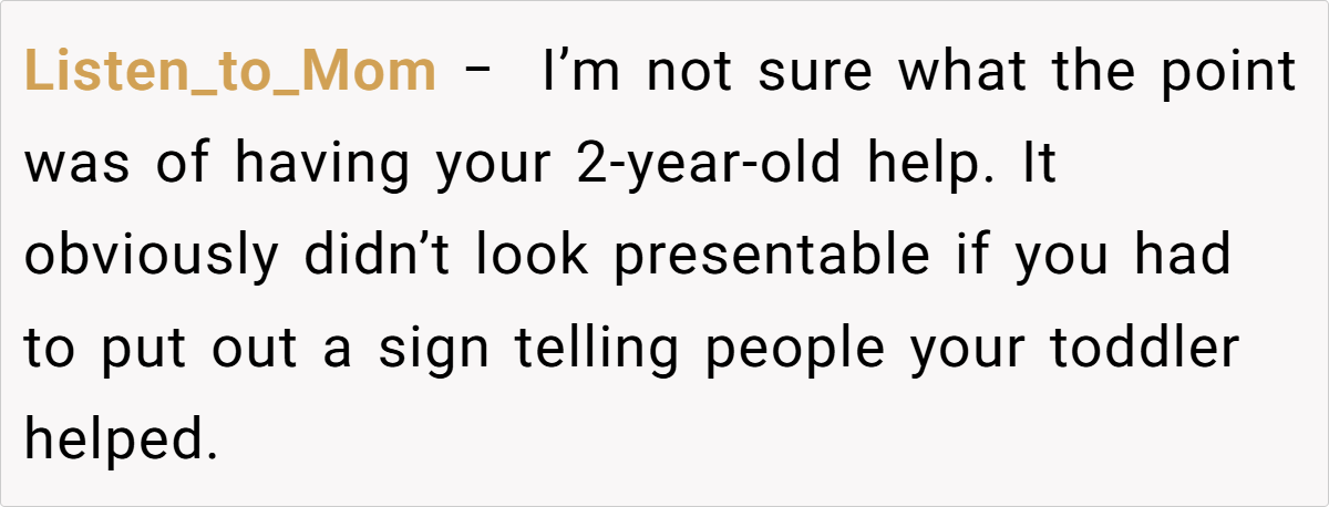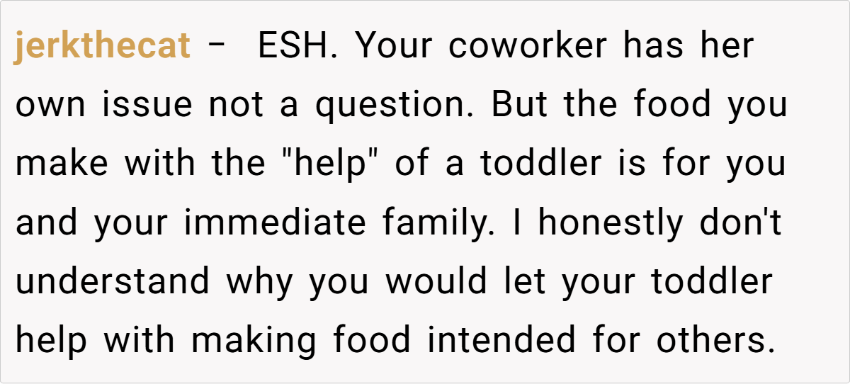 Conversely, others contend that involving a toddler in food prep—and advertising it—undermines professional norms and safety protocols. A few even suspect that the sign was intended to provoke. Overall, while some celebrate the charm of a homemade, family-infused dessert, others maintain that workplace food should adhere to higher hygiene standards.