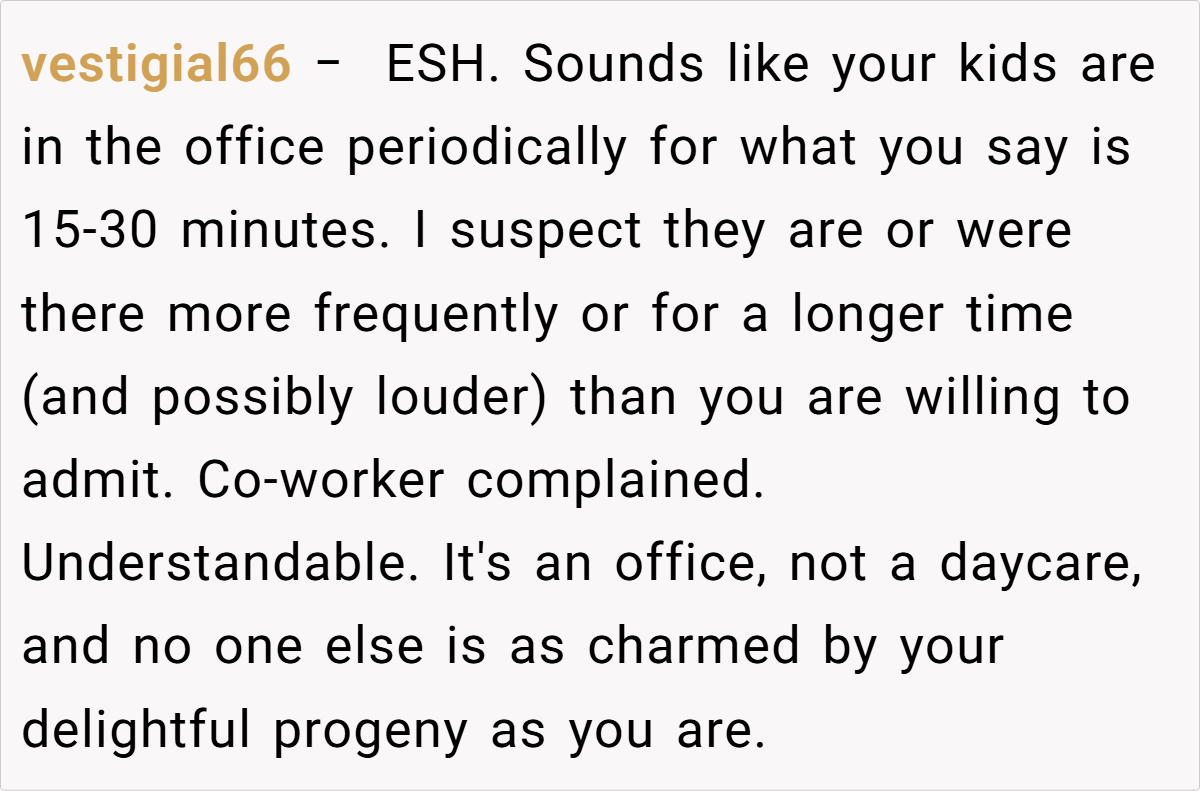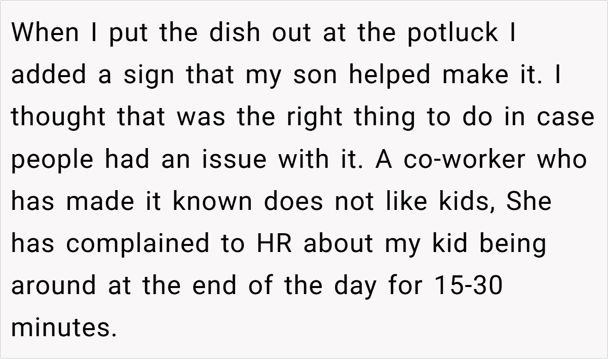 Yet, what was meant as a light-hearted, candid display of parenting soon became the spark for an office feud. One co-worker, who harbors a clear dislike for children in workspaces, took issue and escalated the matter to HR. The situation swiftly transformed a simple dessert into a battleground of opinions and personal boundaries.