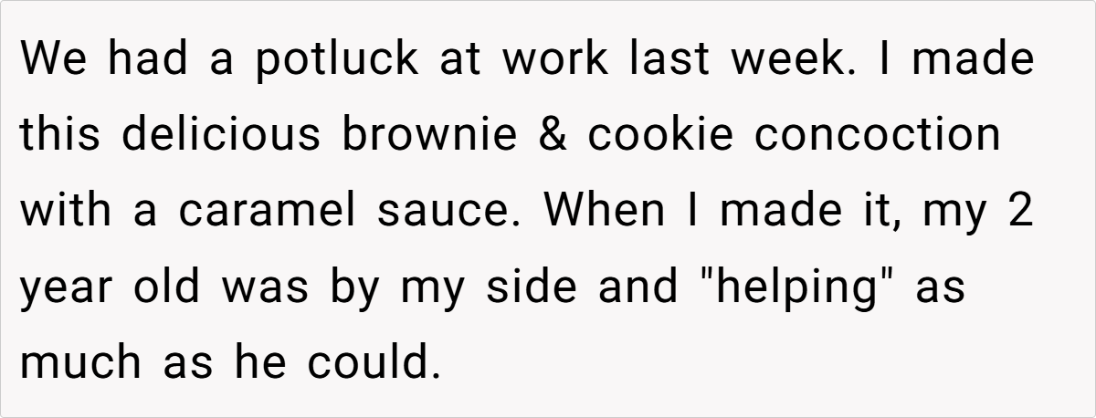 I decided to prepare a unique brownie and cookie dessert drizzled with caramel sauce, enlisting my two-year-old’s adorable assistance. I even placed a friendly sign next to the dish to let everyone know of the family involvement, thinking transparency would allow each person to decide for themselves.