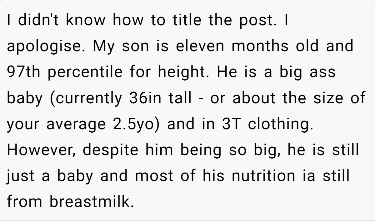 Parenting is as diverse as the families who practice it, and the nuances of feeding, comforting, and caring for a child can vary wildly from one household to the next. In this case, the OP’s decision to breastfeed her baby in a way that suits her and her child’s needs clashed with the expectations of someone who was unfamiliar with the realities of raising a baby who defies the usual size norms.