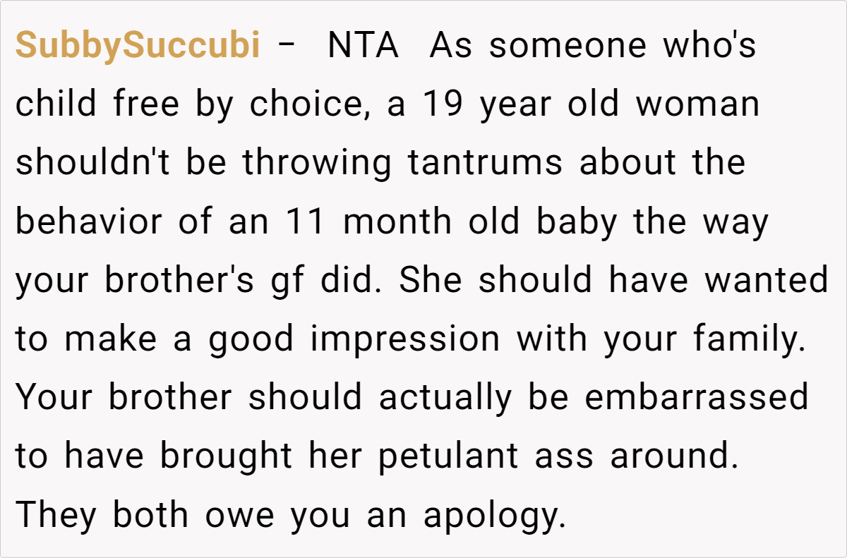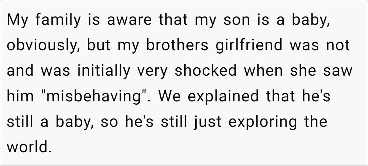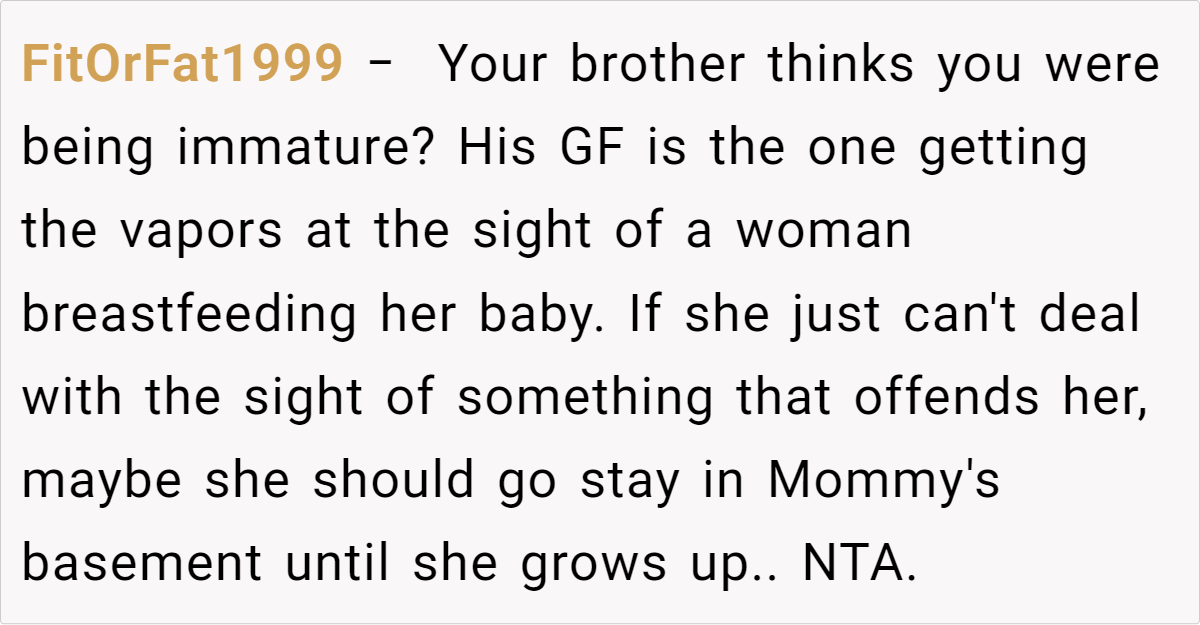 The incident underscores a common problem: the imposition of one’s standards on others in a family setting. The OP’s brother’s girlfriend appeared uncomfortable with the natural process of feeding her baby, misinterpreting normal parenting behavior as something to be corrected. Such reactions often stem from a lack of exposure to the diverse ways babies grow and the myriad of methods parents employ to care for them.