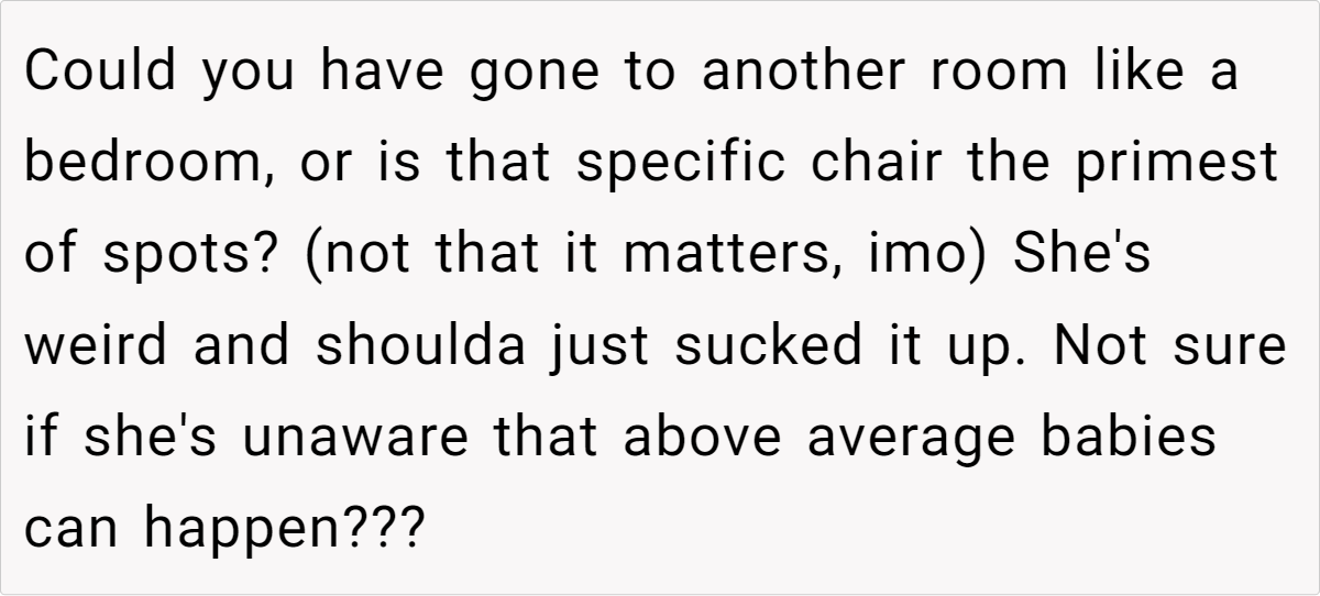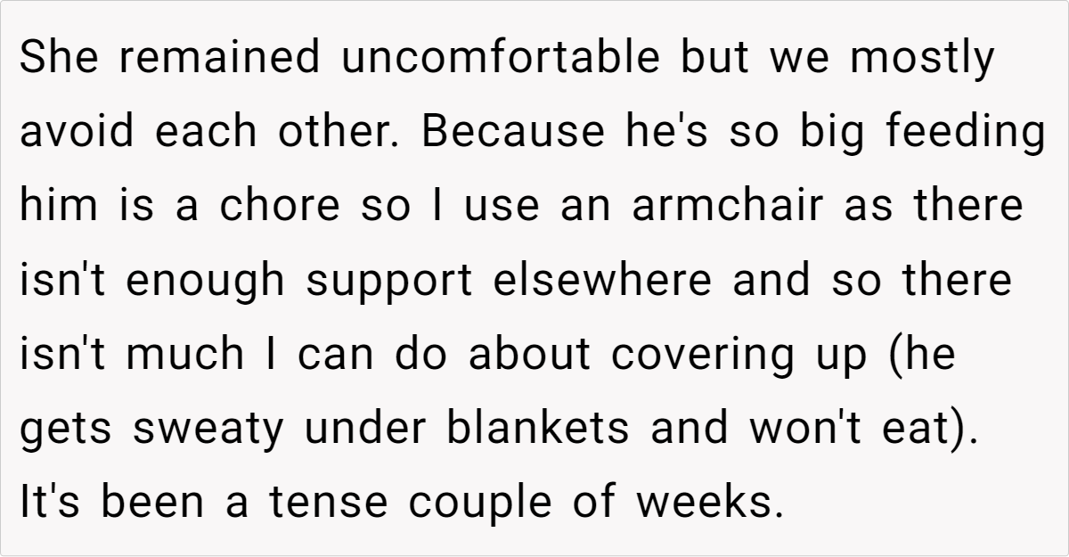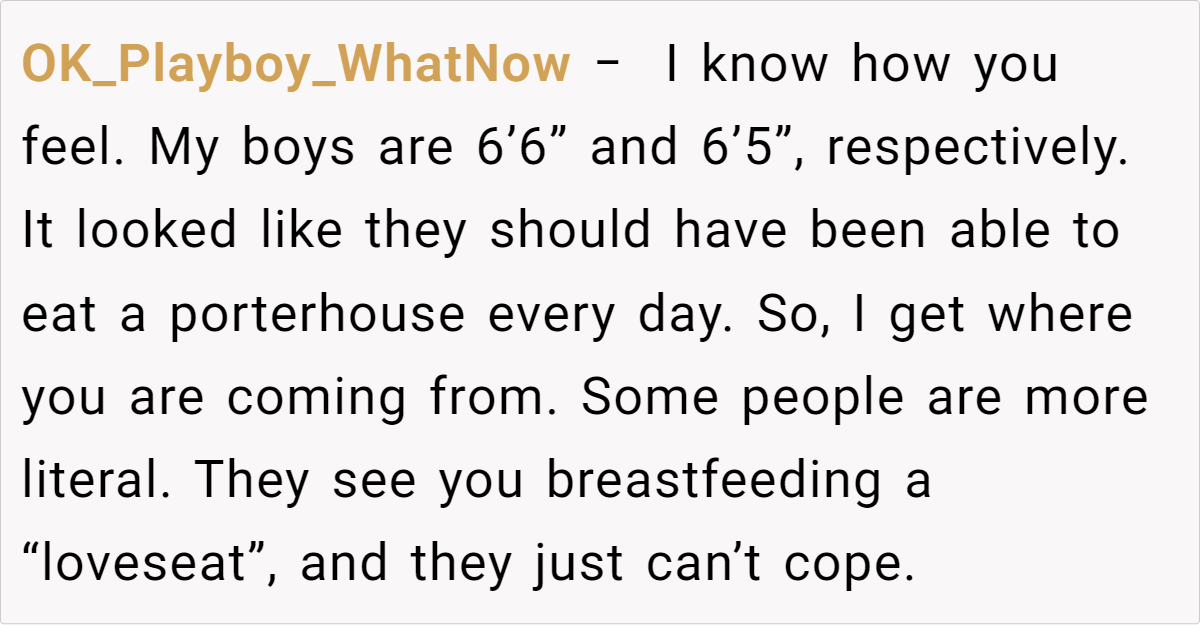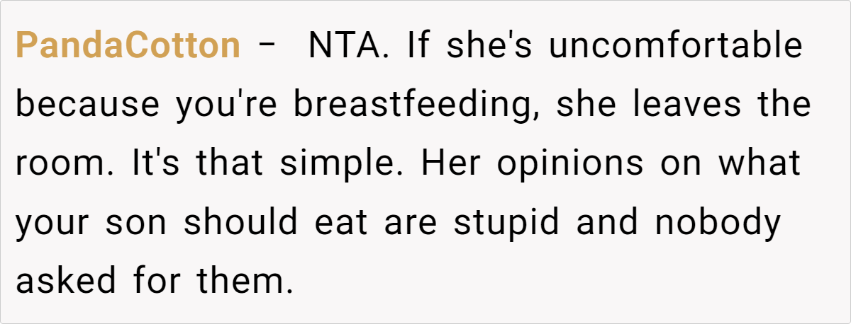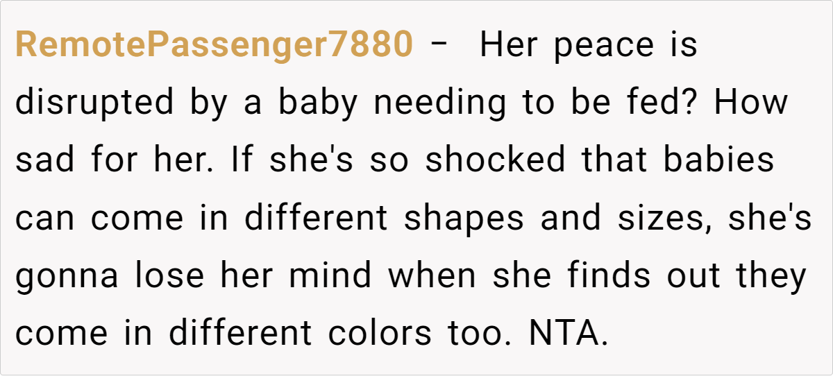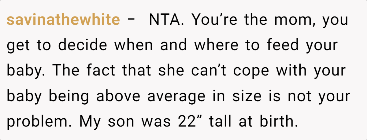 The overall consensus is that the OP was justified in defending her parenting choices. Many commenters pointed out that if someone is uncomfortable with a mother breastfeeding her baby—even one who is remarkably big—they should simply excuse themselves instead of imposing their views. The community largely agrees that the responsibility to “protect one’s peace” should not extend to dictating how another parent feeds or cares for their child.