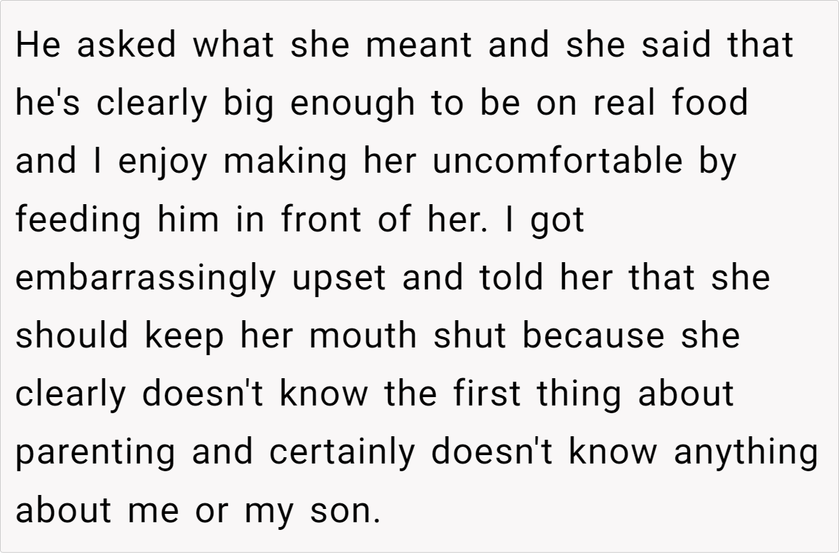 Lastly, the confrontation brings to light the issue of entitlement and unsolicited advice. When someone uninvited starts dictating how a parent should handle routine care—like feeding a baby—the situation can quickly escalate into an unnecessary conflict.