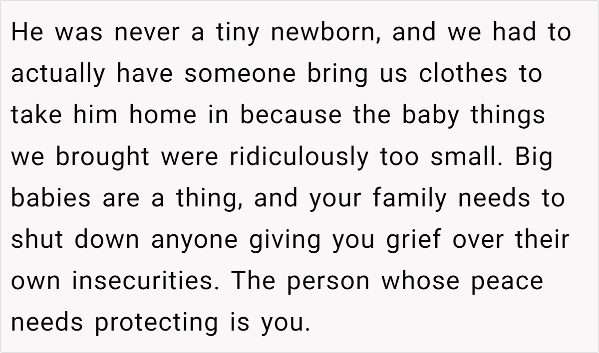 Moreover, this clash reflects the generational gap in understanding modern parenting. While some may cling to outdated norms about how a baby should look or behave, today’s parents are often more flexible and adaptive. The OP’s confident approach—despite her baby’s extraordinary size—demonstrates that effective parenting doesn’t always adhere to conventional expectations.