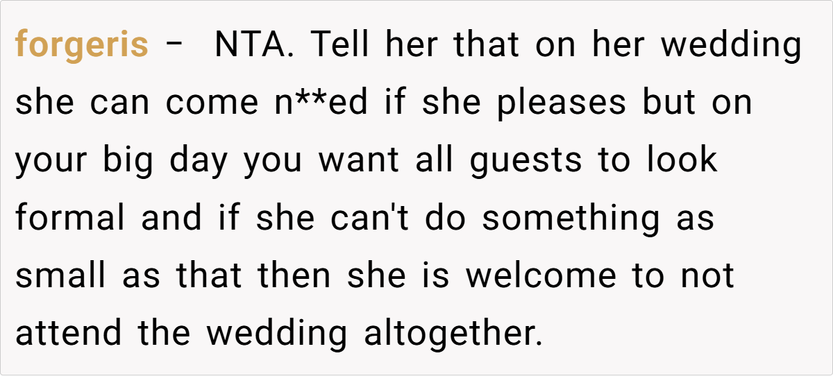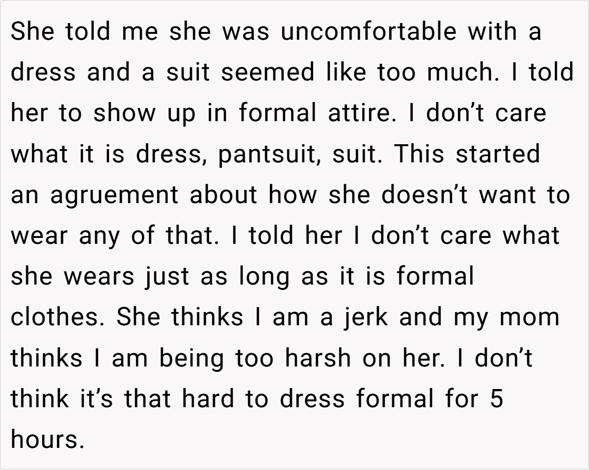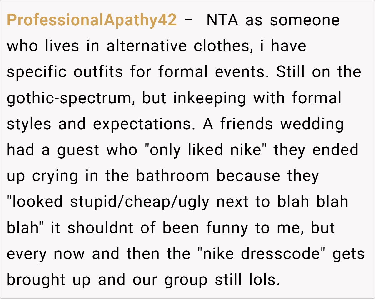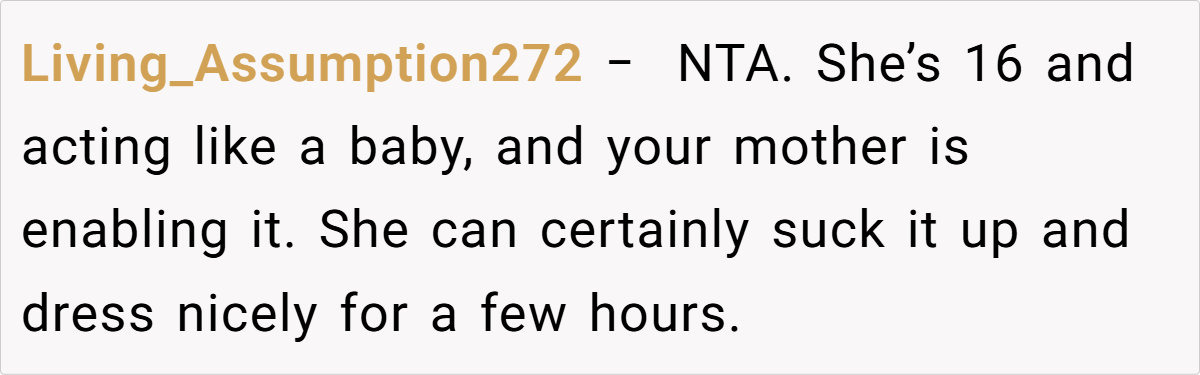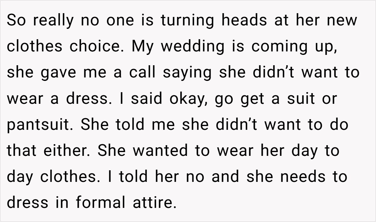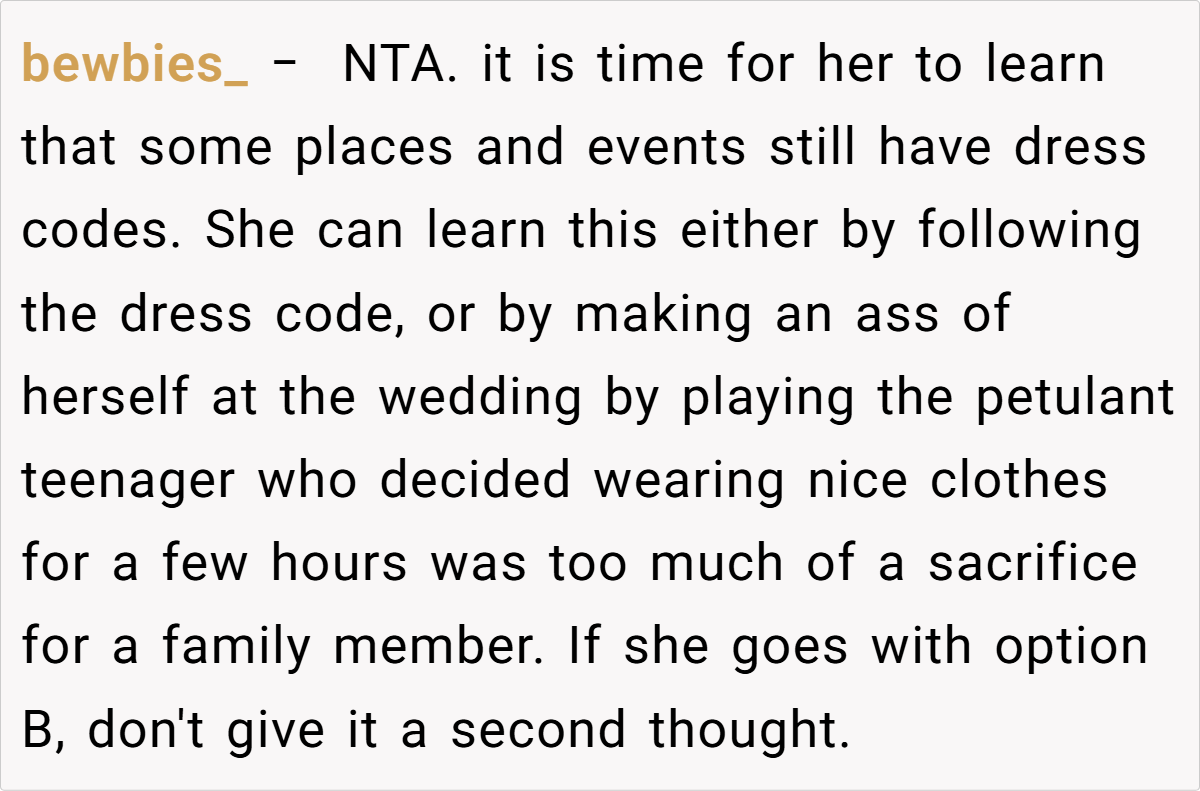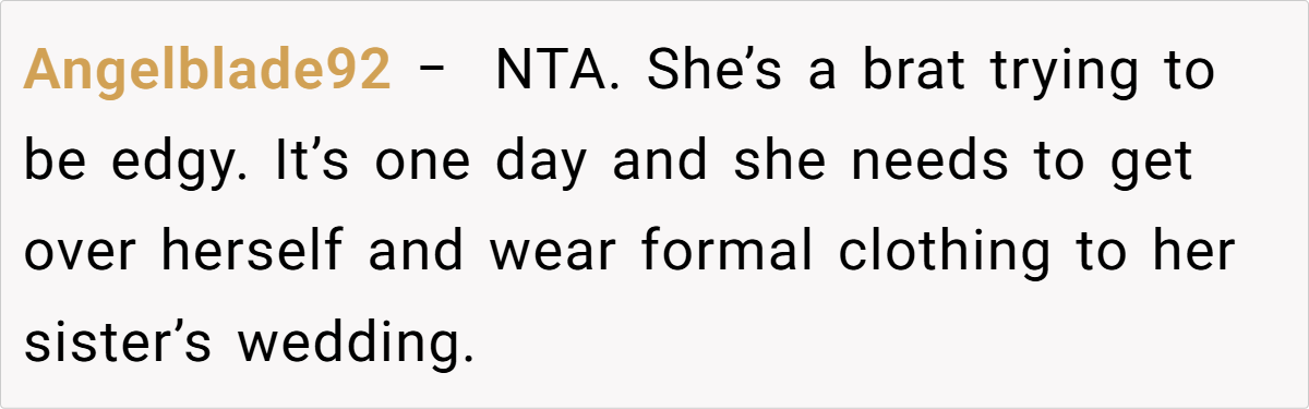 Breaking the issue down, it’s clear that the tension lies in the clash between the sister’s desire for casual comfort and the wedding’s need for formality. For many, formal attire might seem like a small concession for the sake of a memorable day, yet for a teenager experimenting with her style, it can feel like a suppression of her identity.