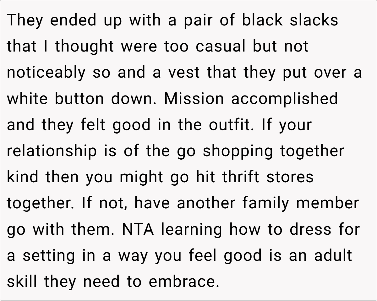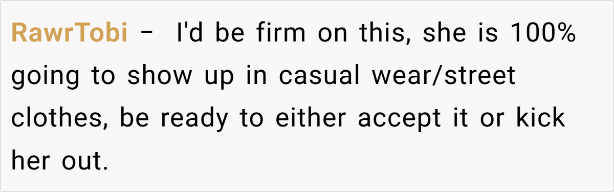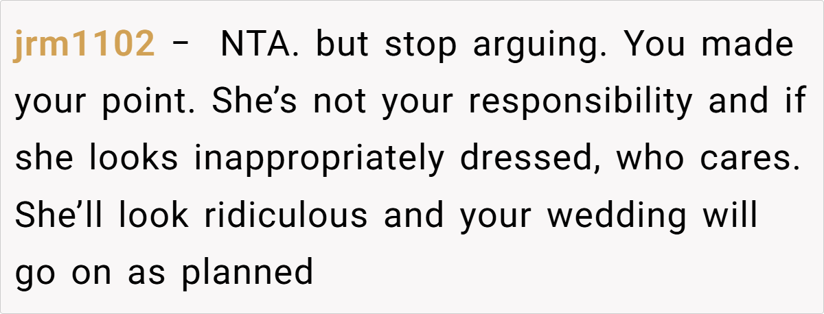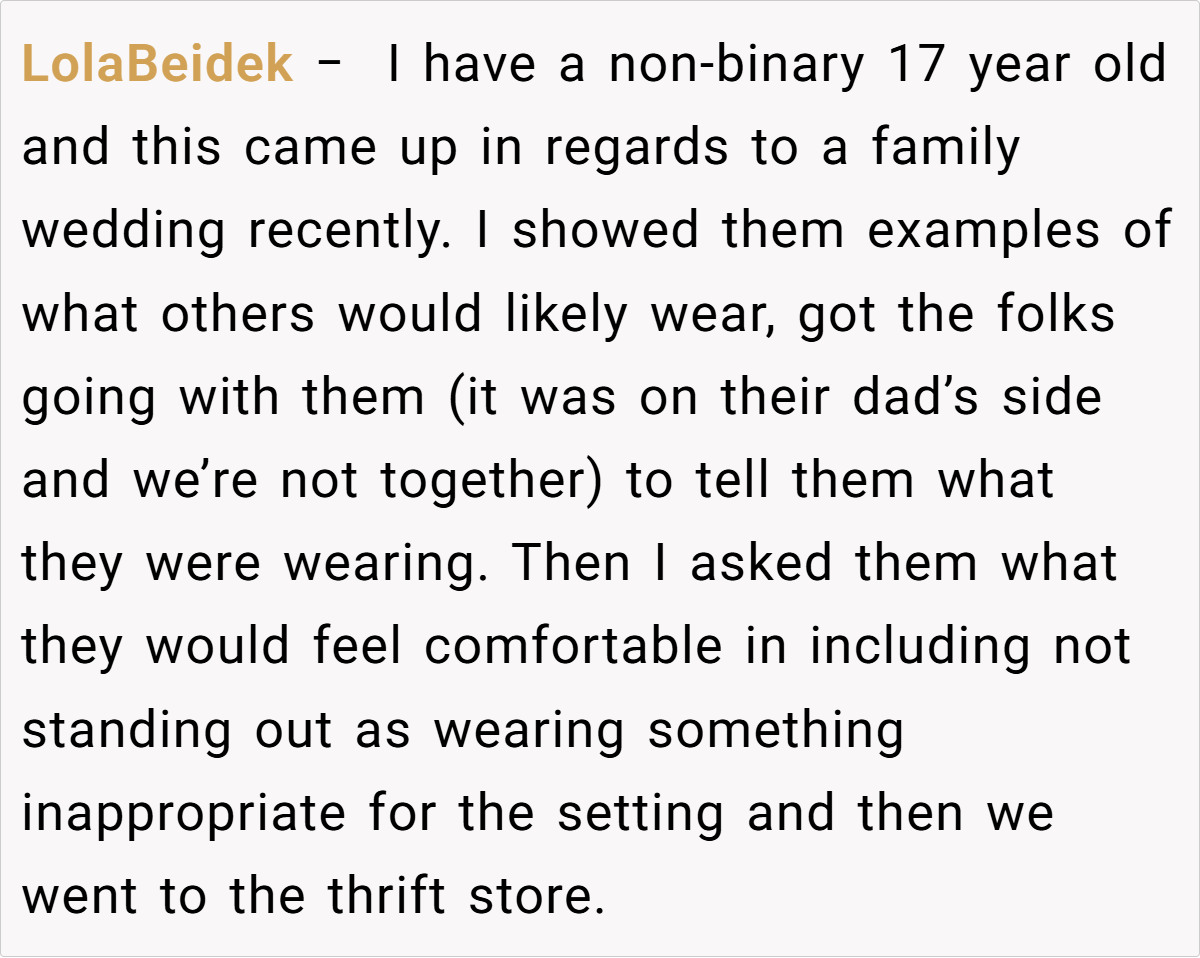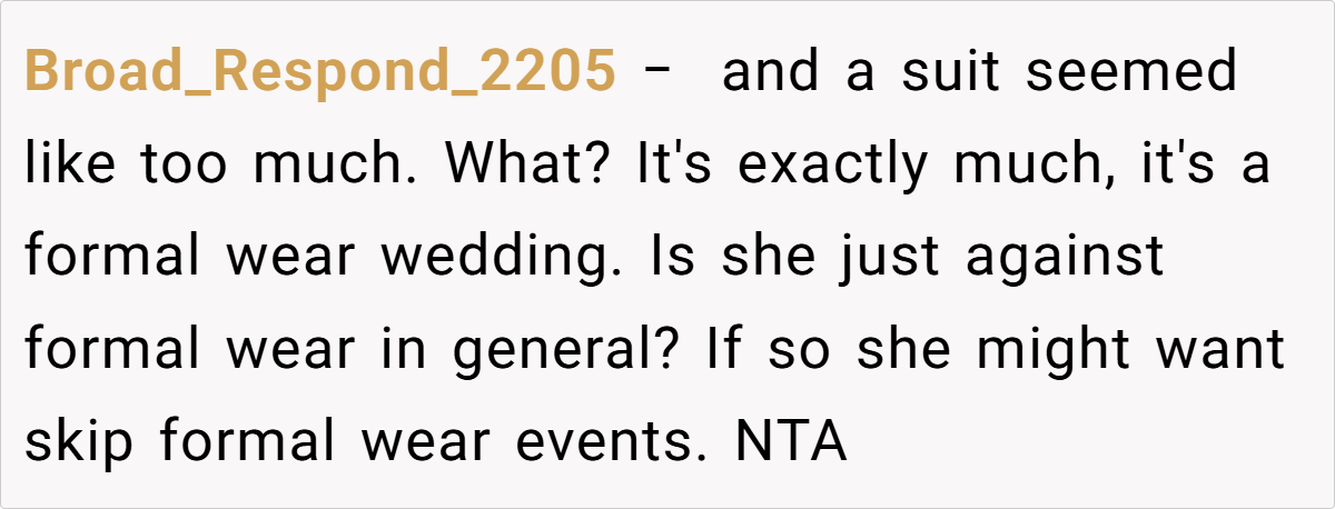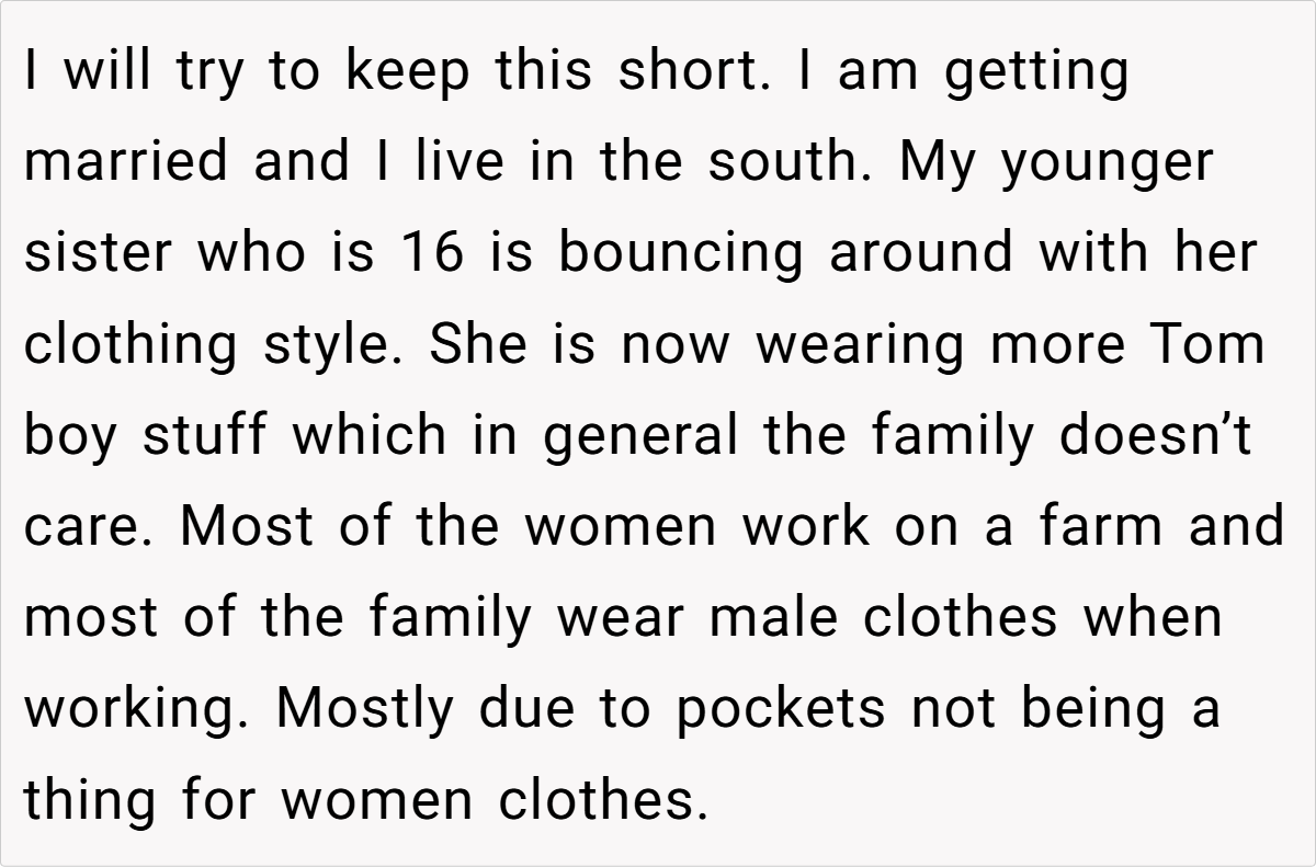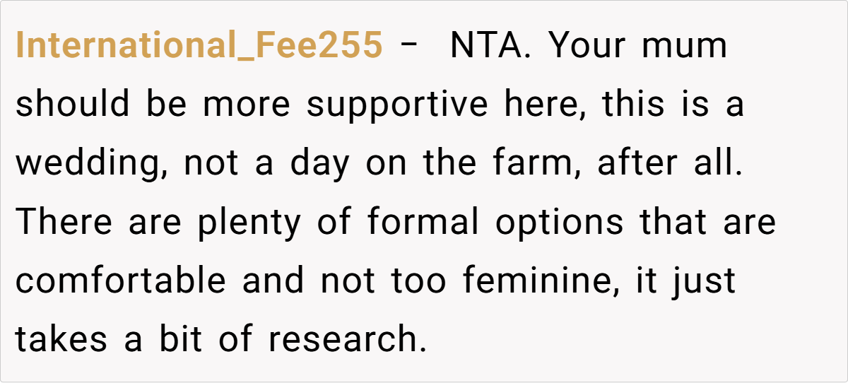 Breaking the issue down, it’s clear that the tension lies in the clash between the sister’s desire for casual comfort and the wedding’s need for formality. For many, formal attire might seem like a small concession for the sake of a memorable day, yet for a teenager experimenting with her style, it can feel like a suppression of her identity.