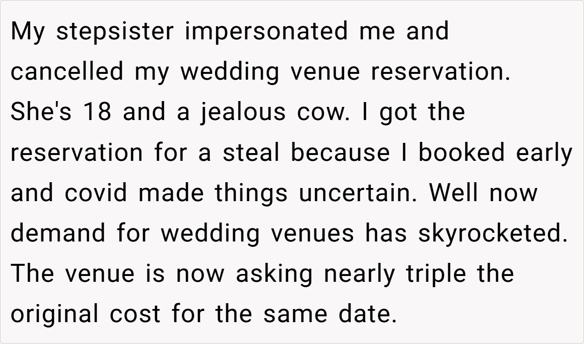 Weddings are supposed to be joyful celebrations of love, but sometimes family drama can turn dream preparations into a logistical nightmare. In this case, a bride-to-be’s stepsister, driven by jealousy and mischief, impersonated her and cancelled her wedding venue reservation—a reservation snagged at a great price by booking early during the uncertain times of COVID. Now, with demand soaring and prices skyrocketing, the venue is quoting nearly triple the original cost for the same date. Faced with a choice between involving the police and preserving family peace, the bride-to-be told her father that he must shoulder the extra cost, leaving him to sell property to cover the difference.