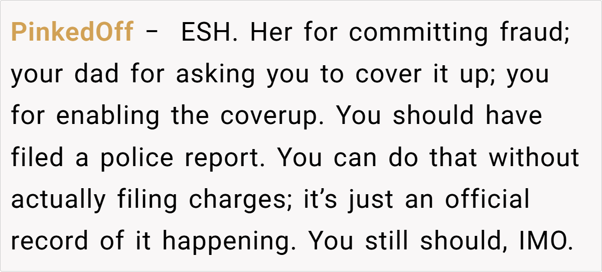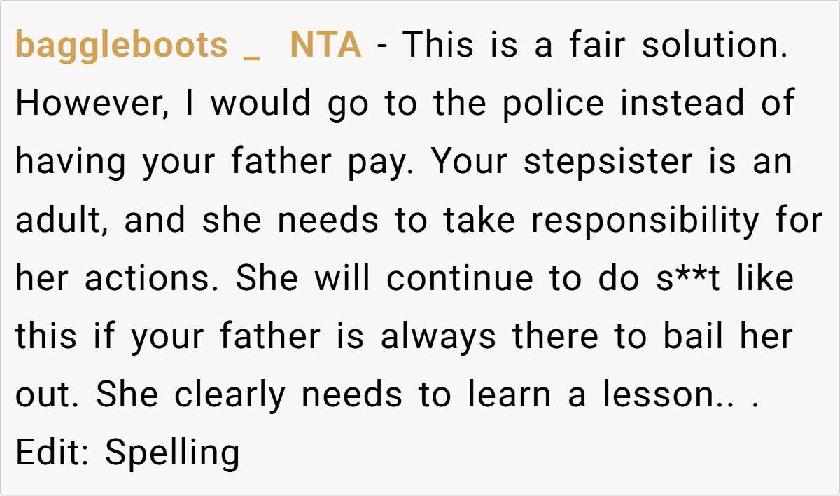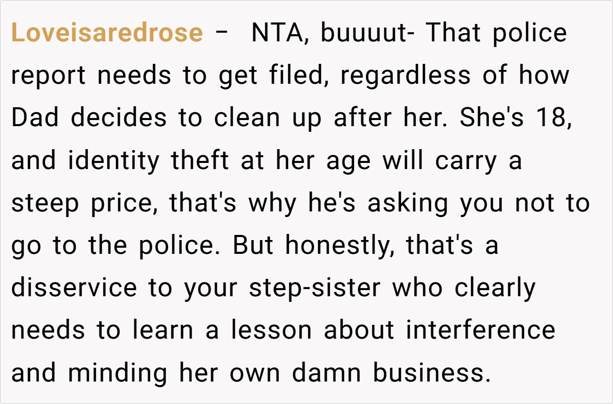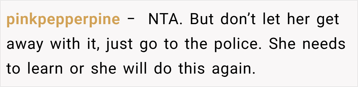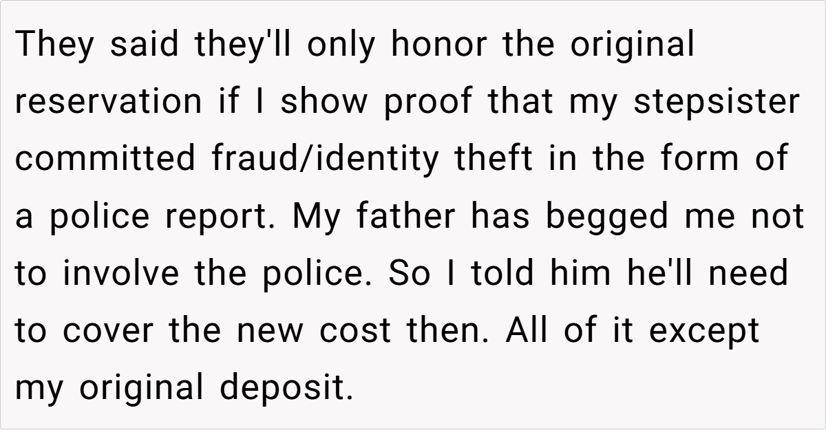 In situations like this, the stepsister’s impersonation not only represents a breach of trust but also highlights a failure in communication and security measures. Experts argue that while it might be tempting to cover up or absorb the costs to maintain family harmony, doing so can set a dangerous precedent. It implicitly condones fraudulent behavior, potentially opening the door for similar actions in the future. The decision to involve legal channels—even if it means incurring a significant financial penalty—is often seen as a necessary step to ensure that such breaches are formally acknowledged and, ideally, deterred.