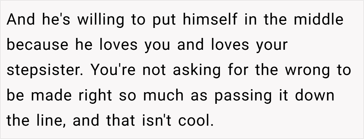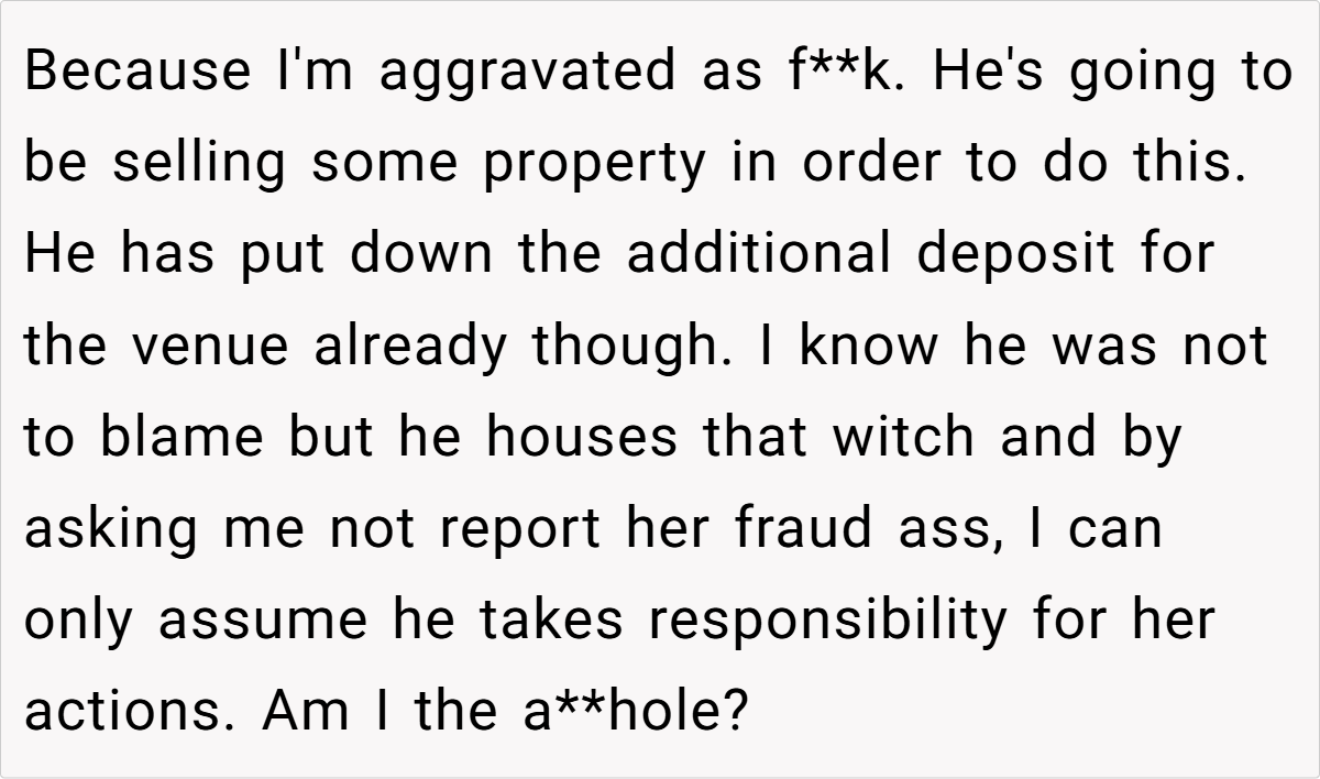 Feeling both betrayed and furious, she stands firm on her decision. Even though she and her fiancé are financially well off, she refuses to be held accountable for her stepsister’s fraudulent actions. This controversial move has sparked a heated debate about accountability, family loyalty, and whether protecting one’s investment justifies placing a heavy burden on a parent.