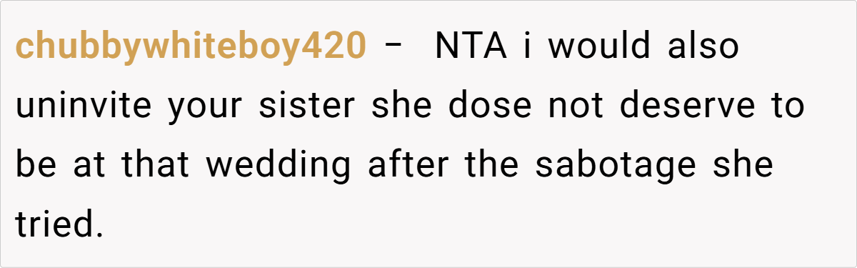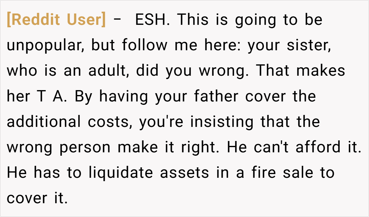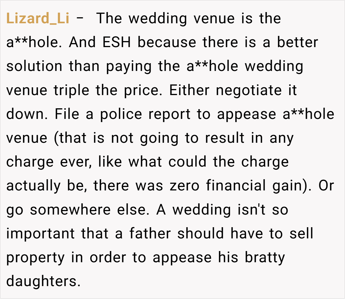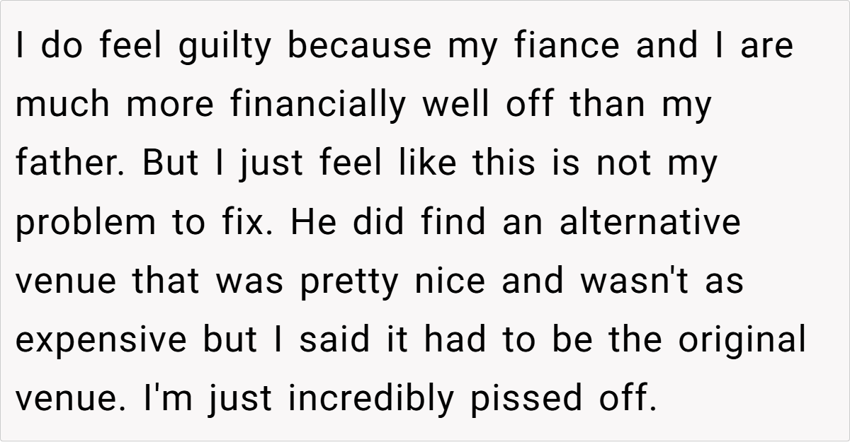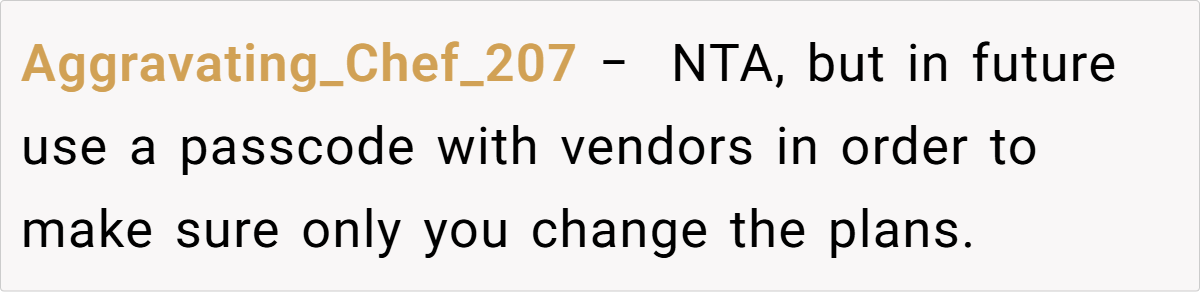 Furthermore, wedding planner and relationship consultant Melissa Rubin notes, “Family drama is, unfortunately, a common undercurrent in wedding planning. However, clear boundaries and strict verification protocols with vendors can mitigate the risk of unauthorized changes. When someone tampers with these arrangements, it’s essential to take decisive action to protect your interests.” By choosing to make her father cover the extra cost, the bride-to-be is not only seeking to recoup her losses but also sending a strong message about accountability. Even though her decision may seem harsh, it reflects her frustration with having to deal with the consequences of someone else’s misdeeds.