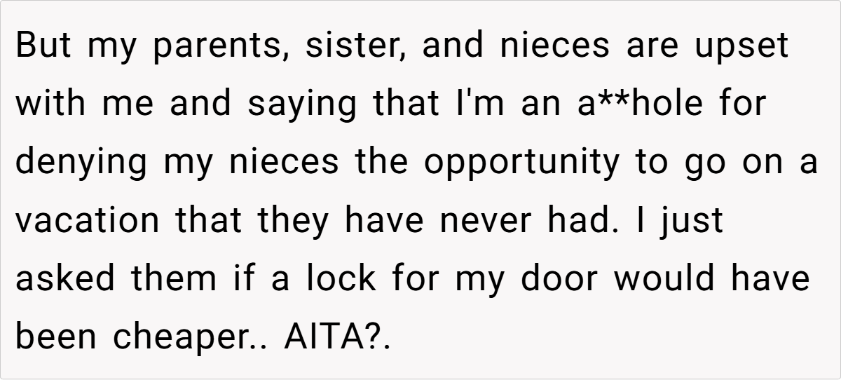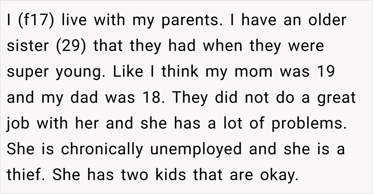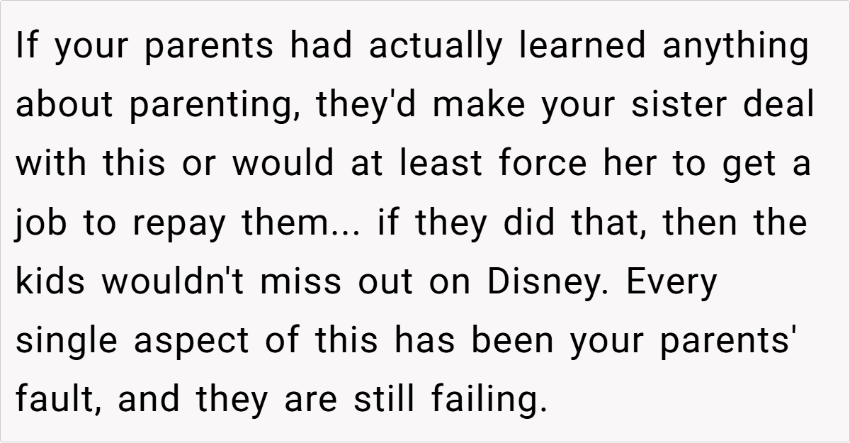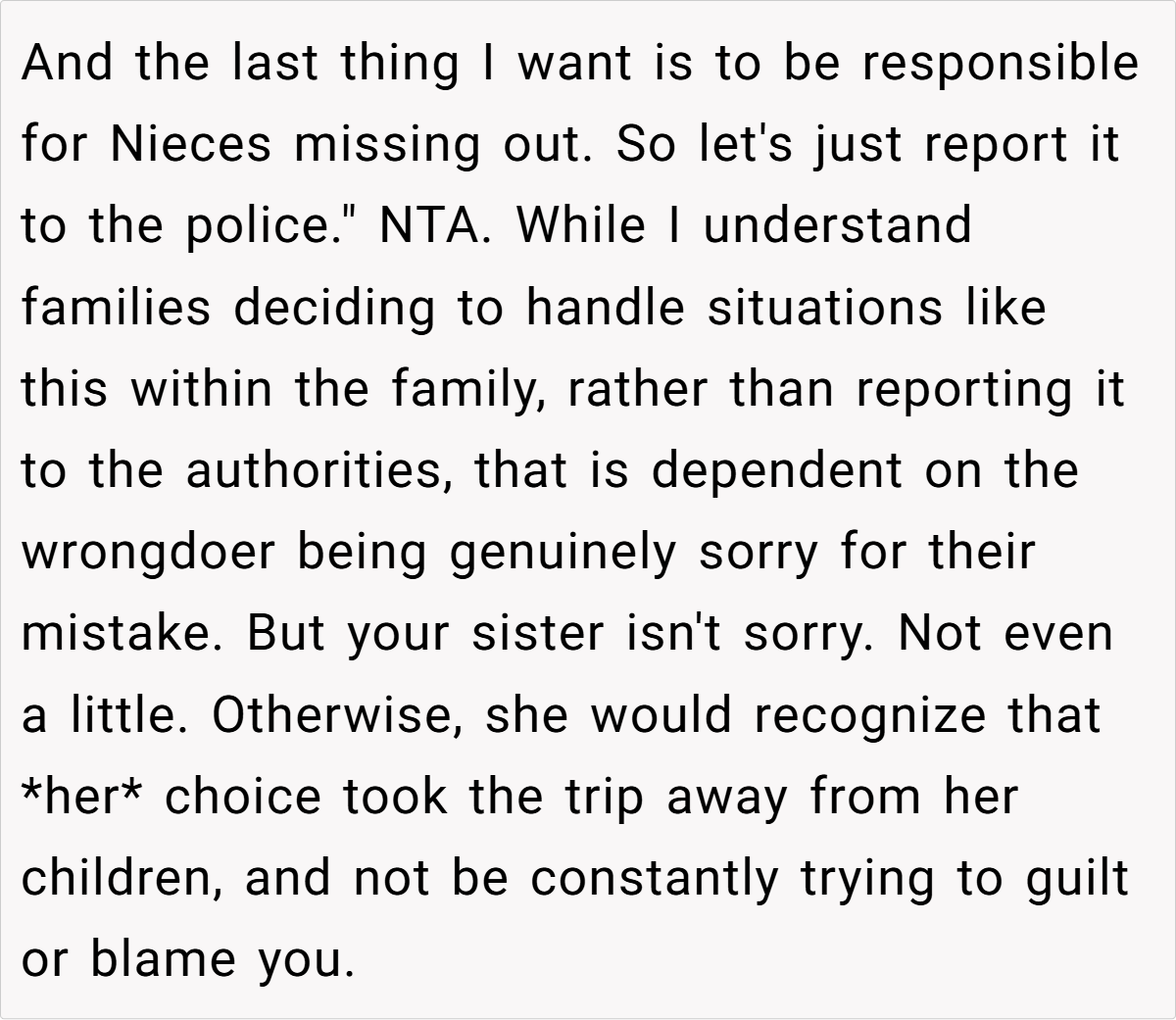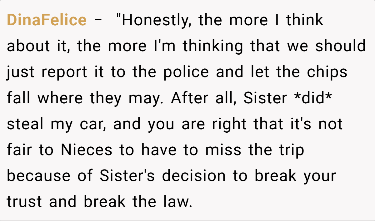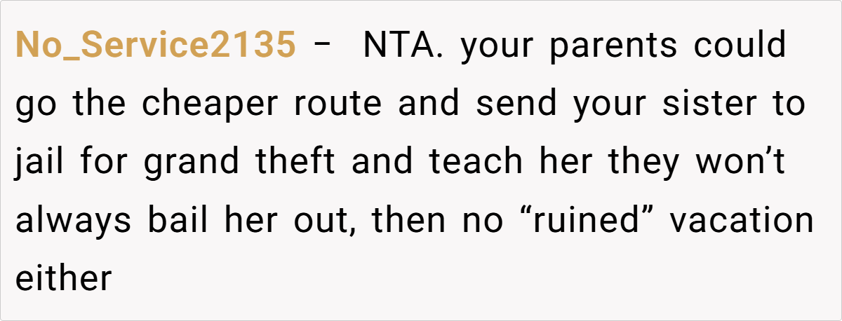 The incident raises questions about accountability and boundaries within a troubled family dynamic. With a history of neglect and repeated poor decisions, the older sister’s actions have put everyone in a difficult position. The OP’s ultimatum—choosing between her sister facing legal consequences or sacrificing a cherished vacation—forces a broader discussion on responsibility, consequences, and the cost of familial loyalty.