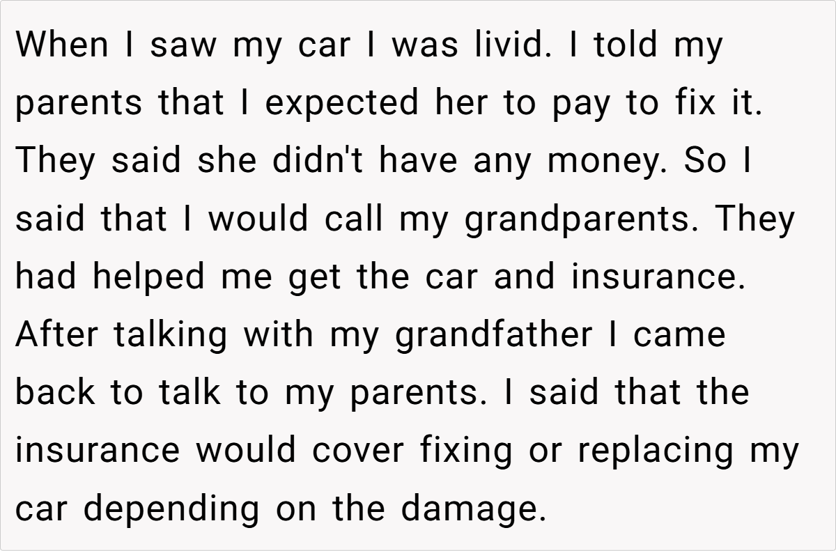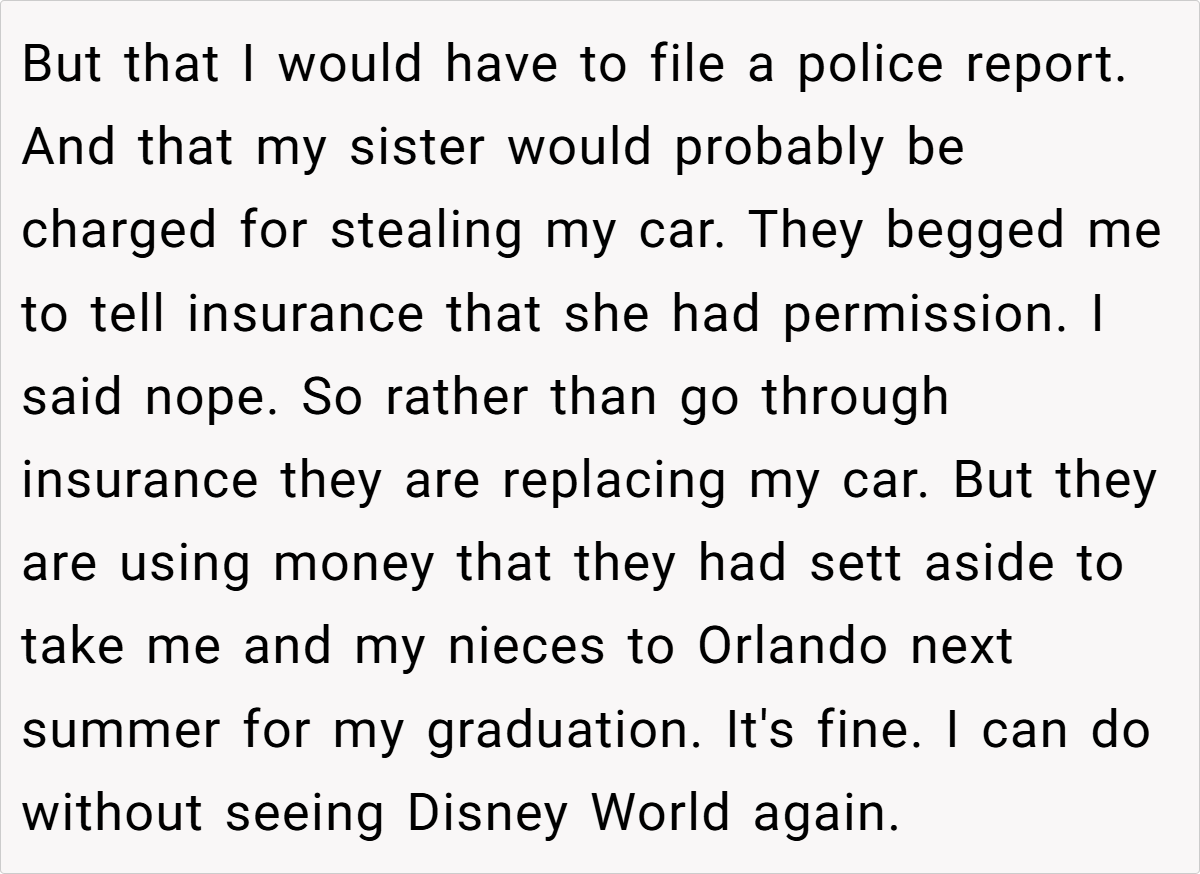 ‘AITA for making my parents choose between my sister going to jail or replacing my car with their vacation money?’