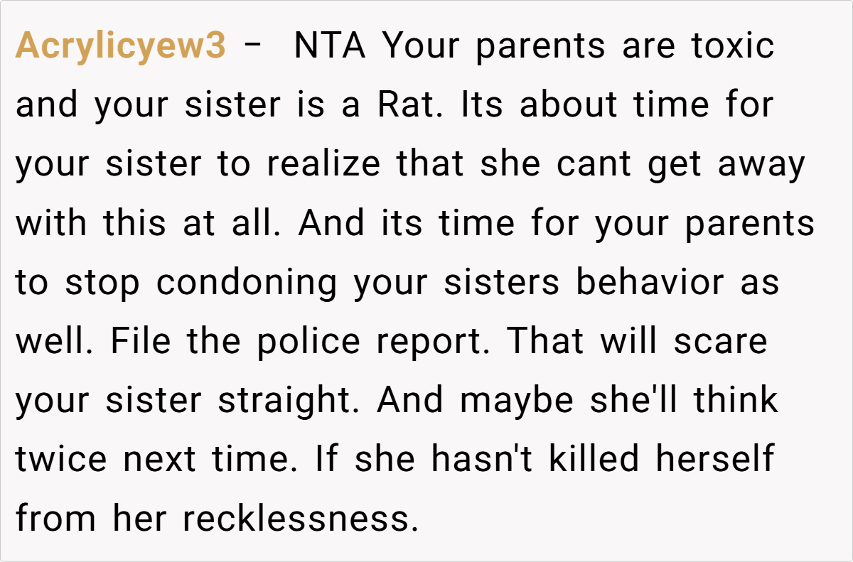 The comments span a spectrum of reactions, with many echoing the OP’s sentiment that a simple lock might have prevented this costly dilemma. Yet, others warn that letting the sister face legal consequences could have long-term consequences for the entire family dynamic.