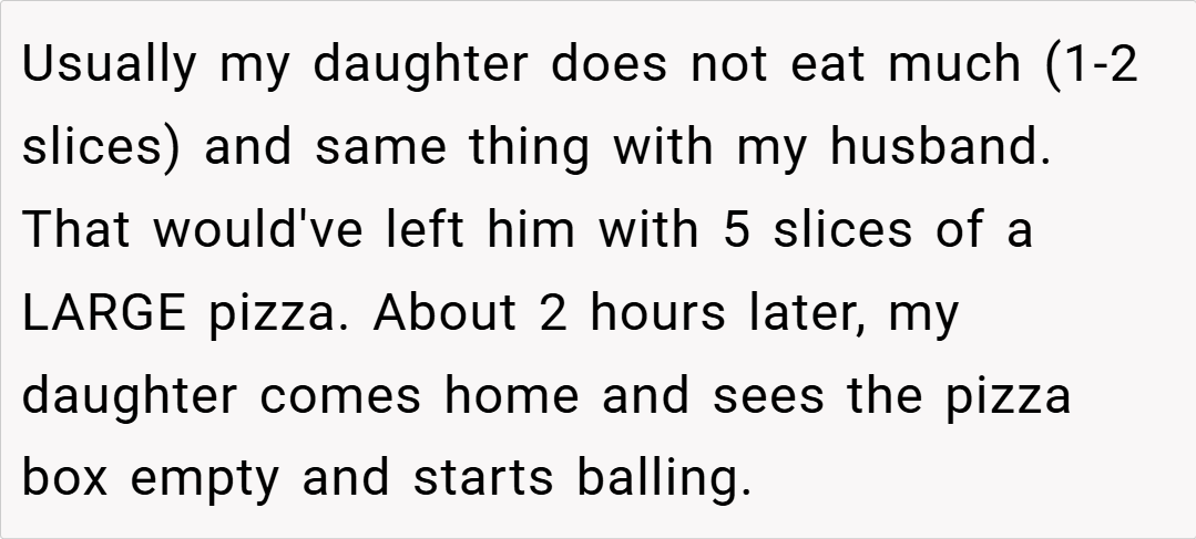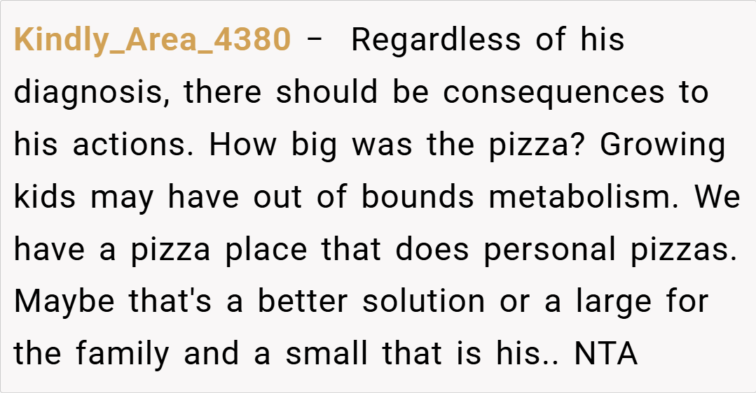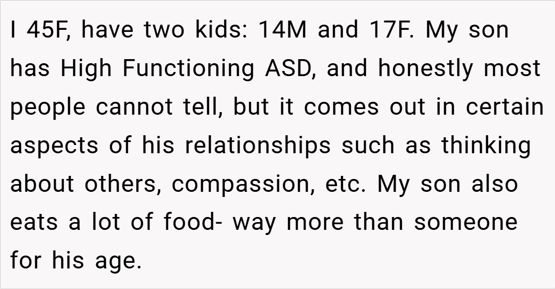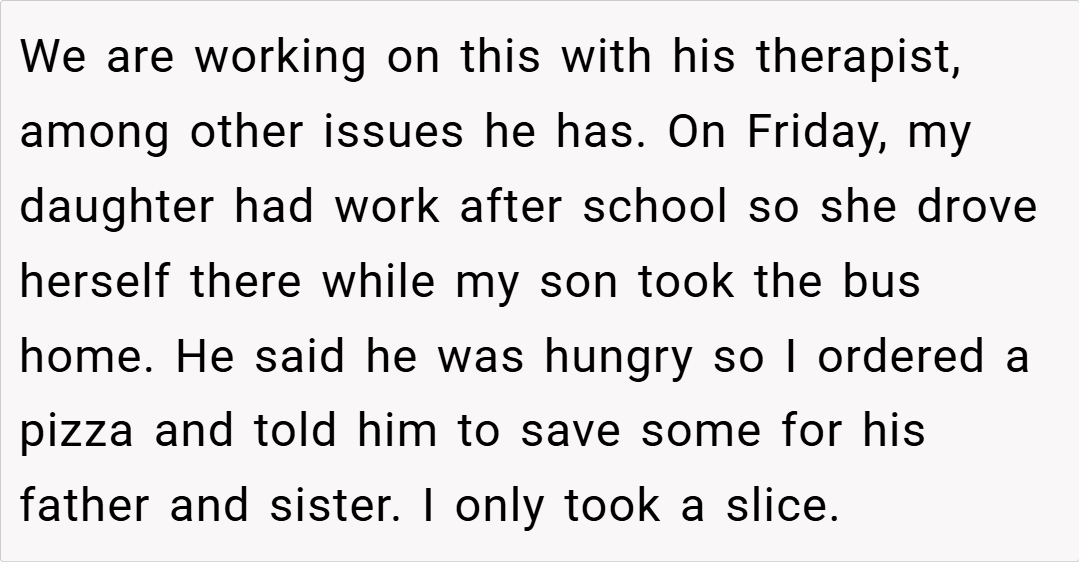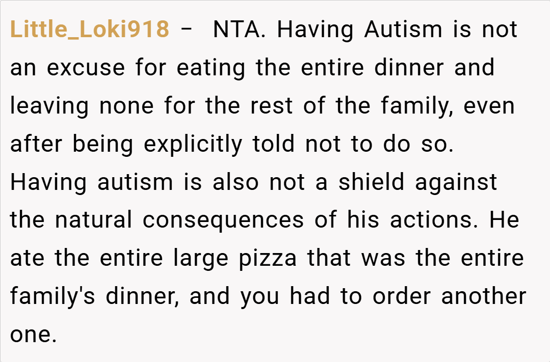 Family meals are meant to bring everyone together, but sometimes even something as simple as a pizza can become a flashpoint for deeper issues. In this story, a 45-year-old mother recounts how her 14-year-old son—who has high-functioning ASD—has repeatedly neglected to save enough food for the rest of the family.