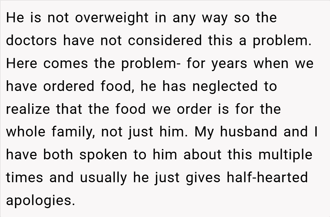 Despite numerous reminders and half-hearted apologies over the years, the issue persisted. At a recent family dinner, after ordering a pizza with the clear instruction to save some for his father and sister, the pizza was entirely consumed by him. When his 17-year-old sister returned home and saw an empty box, she was understandably upset.