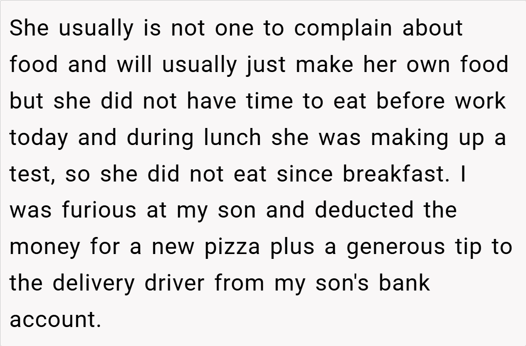 Ultimately, your decision to deduct the cost of a new pizza from your son’s bank account isn’t about being mean—it’s about enforcing a lesson in shared responsibility. While your son may argue that his limited income should exempt him from such consequences, the fact remains that repeated behavior that neglects the needs of the entire family demands a response. Your action is a bitter but clear statement: communal resources must be respected, and accountability is key.