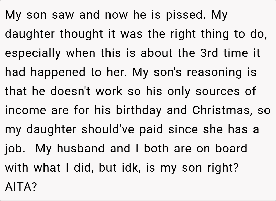 In response, the mother deducted the cost of a new pizza (plus a generous tip) from his bank account. Now, the son is furious, and while his sister supports the decision, he argues that since he doesn’t work and his income is limited to birthday and Christmas money, he shouldn’t bear the brunt of the punishment. The mother is left wondering if she’s being too harsh or if her action was completely justified.