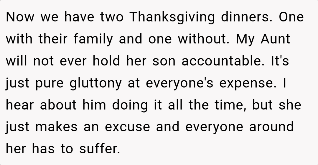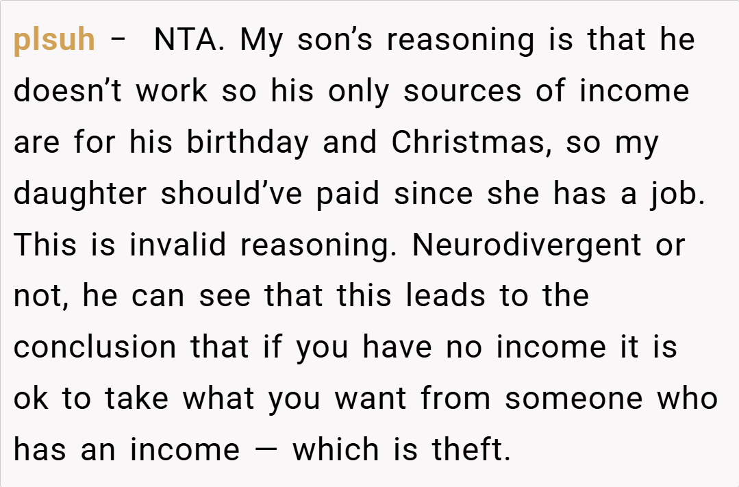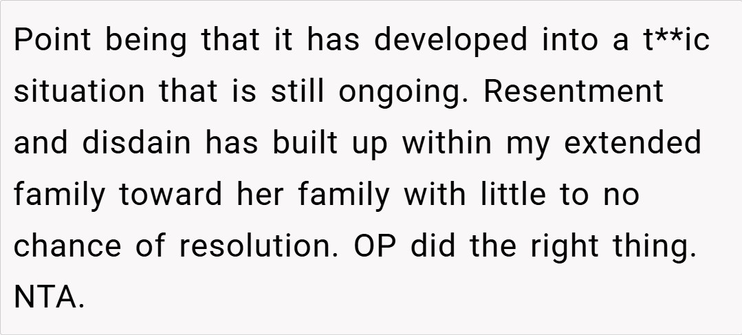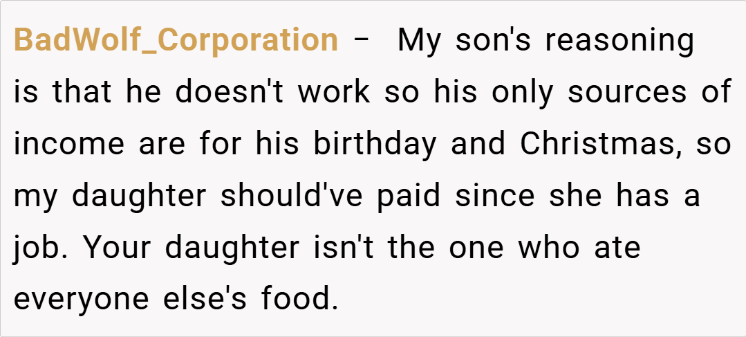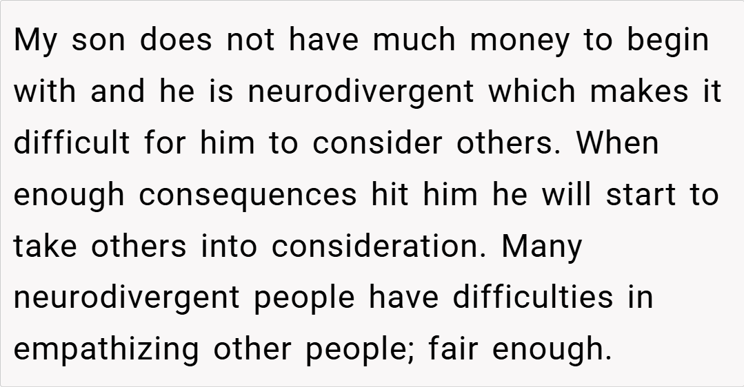 Another group shared similar experiences, with one commenter stating, “I’ve had a family member who never learned to share properly, and a financial consequence was the wake-up call they needed. You’re standing up for the rest of the family’s needs, and that’s fair.”