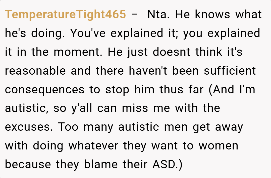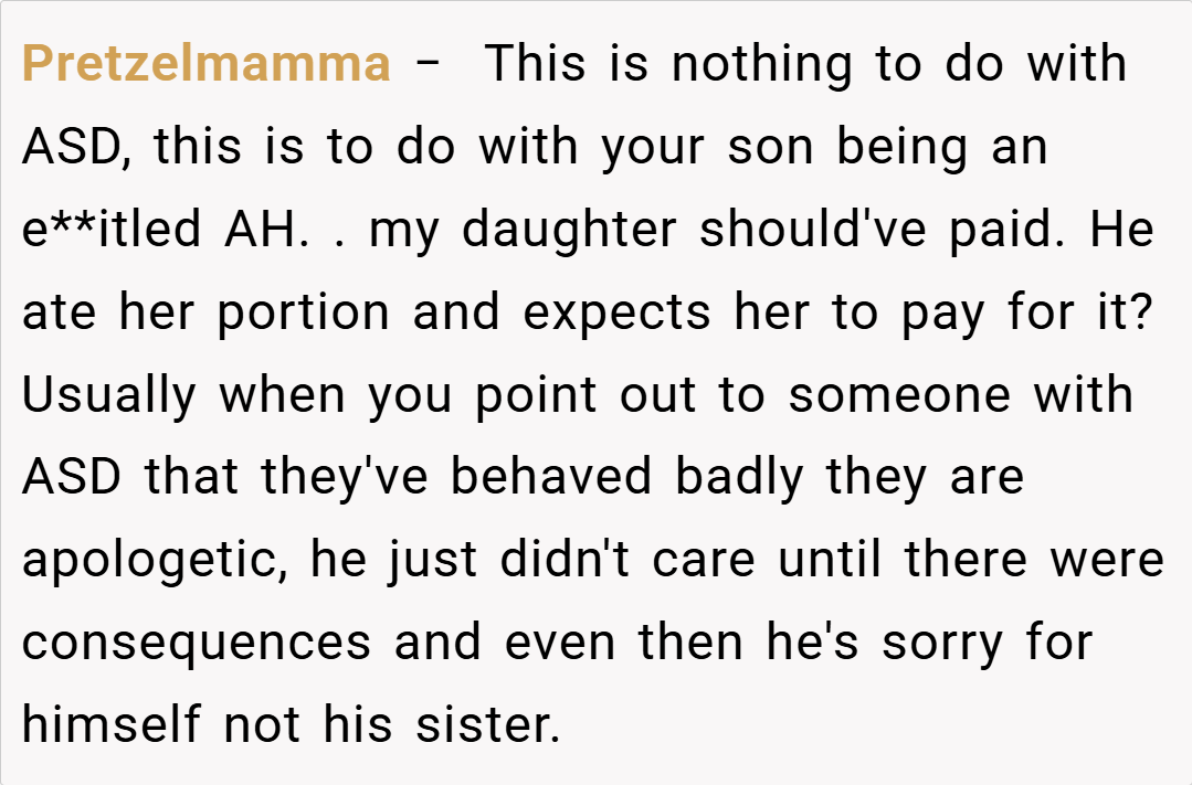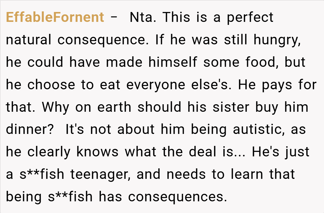 I am autistic myself, and this is not typical behavior. It is true that what’s happening to an autistic’s mind is more important than what’s going on around them, but simply eating it all is a big mistake. I eat a great deal of food in one go, and so we all just learned to get me my own food and everyone else gets theirs. But since I am not a child, I usually pay for it. The idea that his sister should pay for new food so she could actually eat in her exhausted state is entirely unreasonable. This is a penalty, and even autistics are subject to penalties.