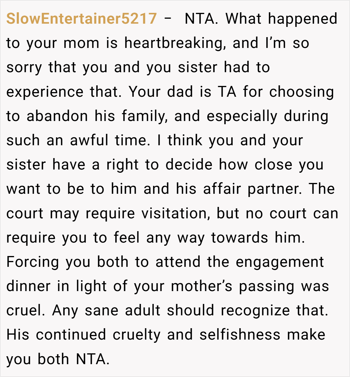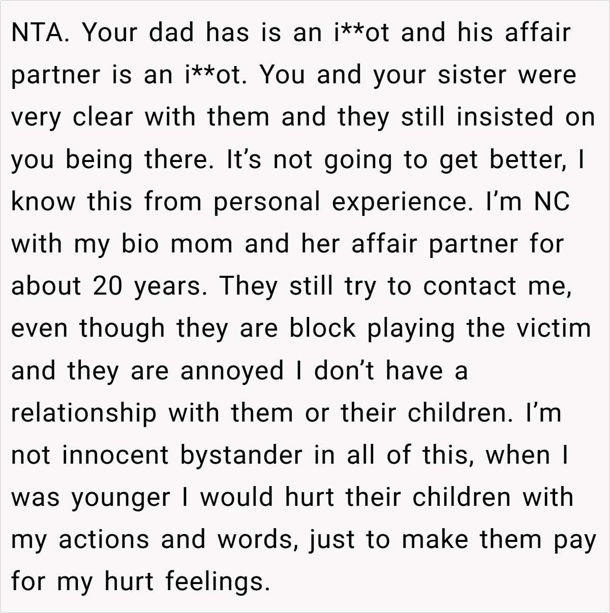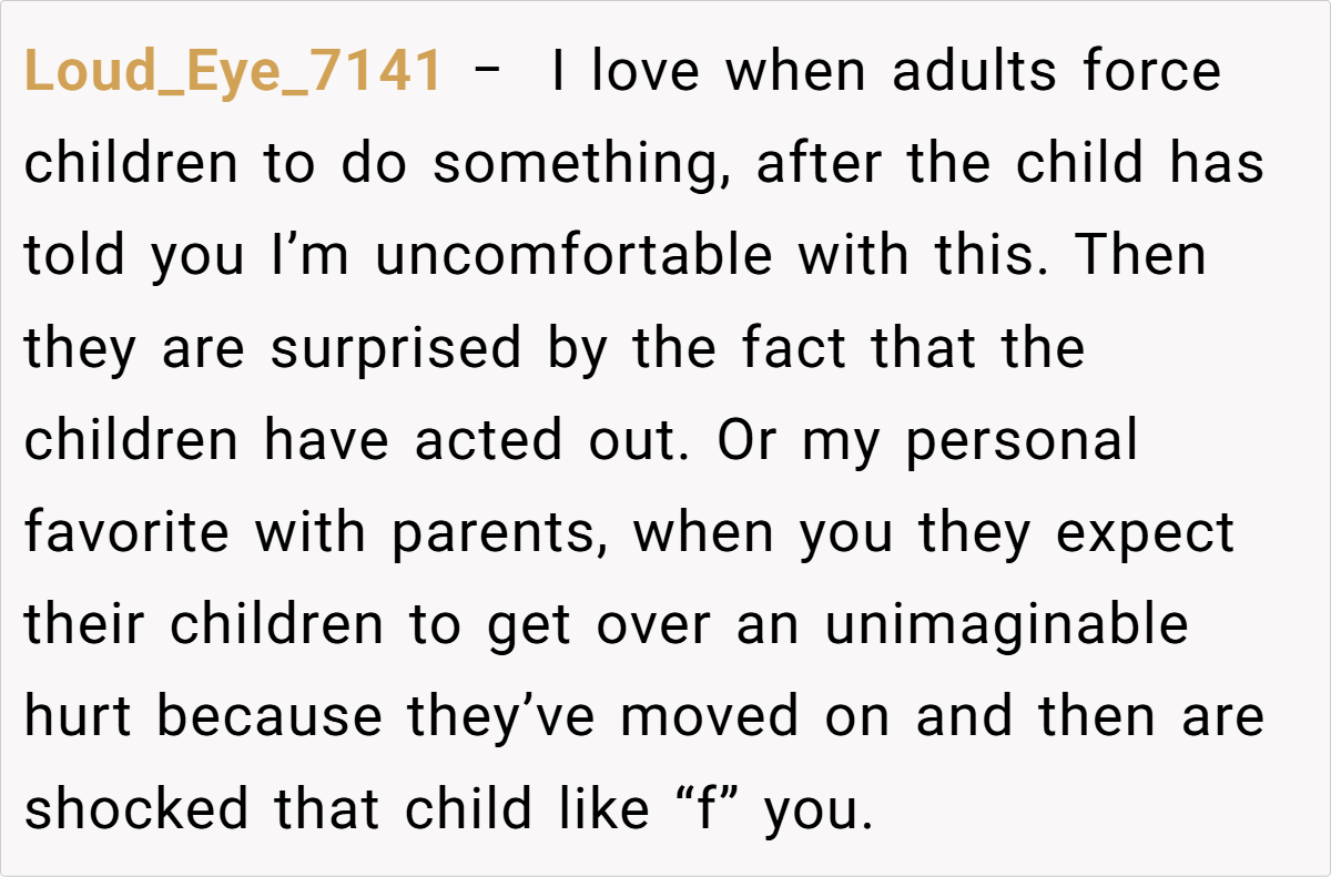 The pressure placed on this teen to participate in a celebration that felt forced and inauthentic only deepened her sense of betrayal. In cases like these, open communication and professional counseling could help bridge the gap between a parent’s desire for reconciliation and a child’s need for emotional safety.