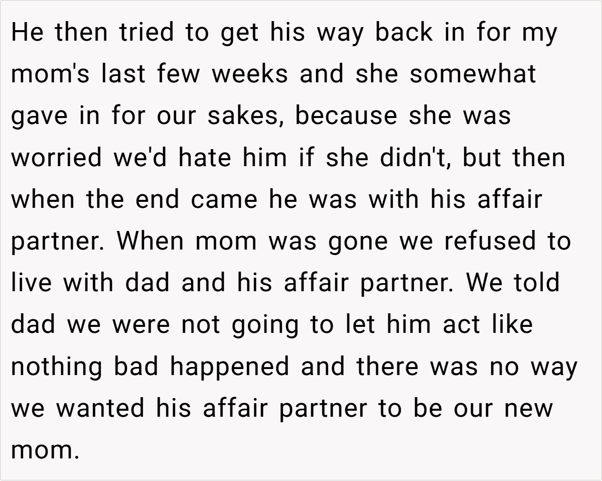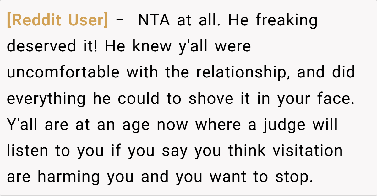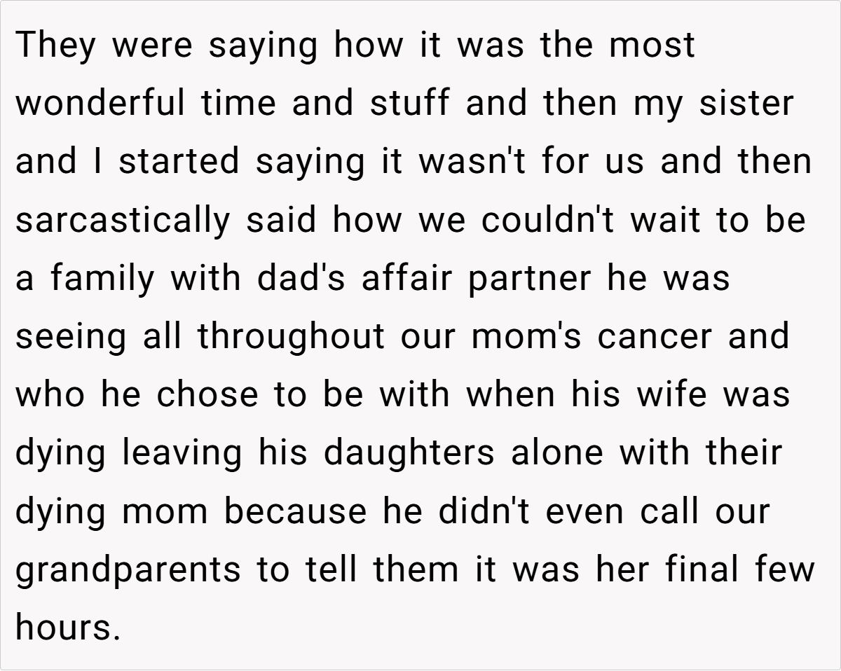 The pressure placed on this teen to participate in a celebration that felt forced and inauthentic only deepened her sense of betrayal. In cases like these, open communication and professional counseling could help bridge the gap between a parent’s desire for reconciliation and a child’s need for emotional safety.
