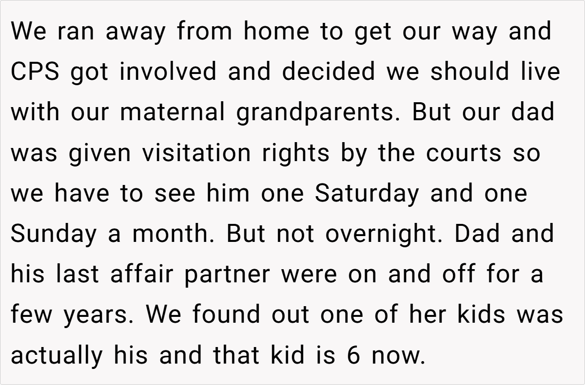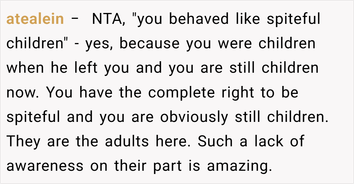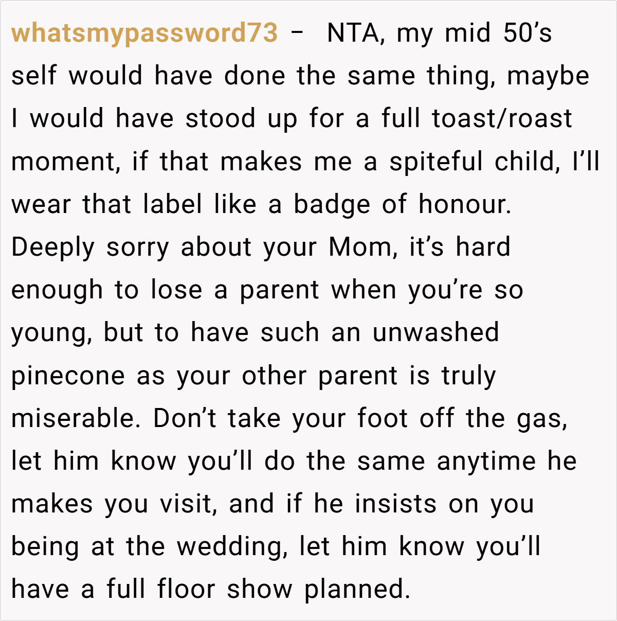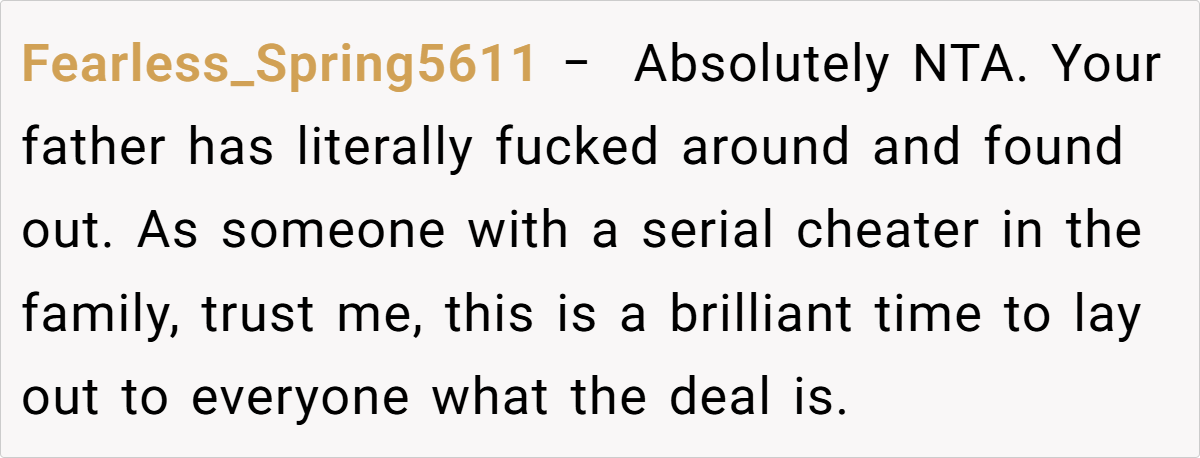 The consensus among commenters is clear: the teen is not at fault. Many applaud her for standing up against a father who repeatedly failed her, while others even celebrate her “spiteful” remarks as a justified response to decades of emotional neglect. The community emphasizes that it is not a child’s responsibility to smooth over or cover up the misdeeds of adults, especially when those misdeeds have left deep scars.