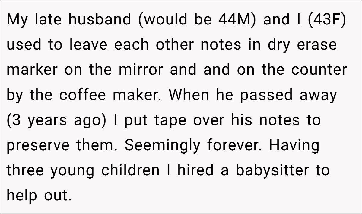 ‘AITA for needing more time to sort out how I feel about the babysitter erasing a love note from my late husband?’