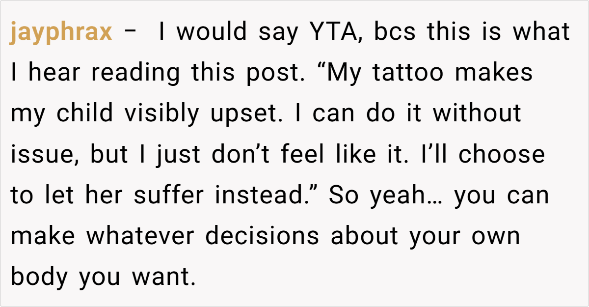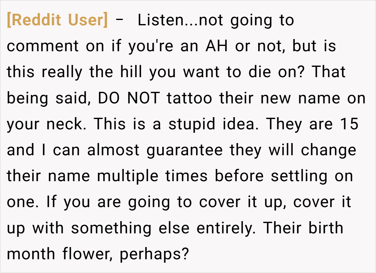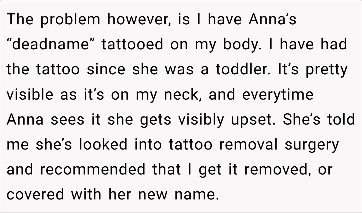 Parenting is full of challenging choices, but sometimes a single decision can spark a fierce family debate. For one 36-year-old mom, a tattoo from her daughter’s early years has evolved into a painful symbol. Despite her transgender daughter’s clear distress every time she sees her deadname inked on her neck, the mom remains firm in her choice—not because she lacks love, but because she views the tattoo as a personal mark of the past that doesn’t need erasing.