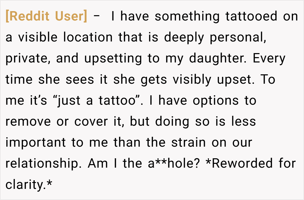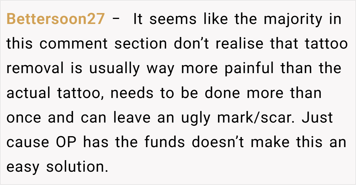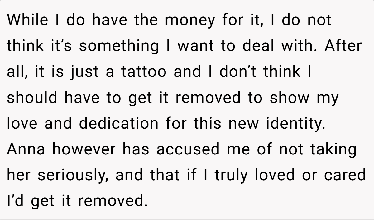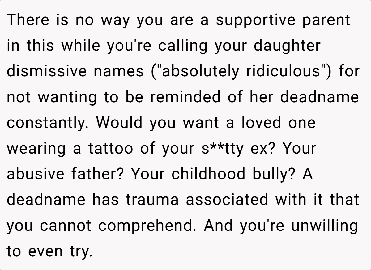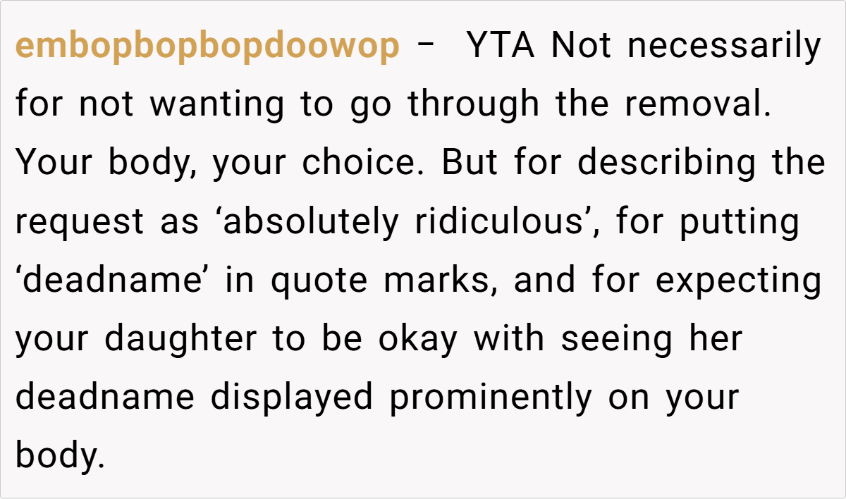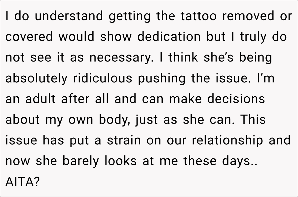 This conflict cuts deep into the heart of their relationship. While the daughter sees the tattoo as a daily reminder of a name that no longer reflects her identity, her mother believes that bodily autonomy means she can decide what stays on her skin. With tension mounting and emotions running high, the question looms large: Am I the a**hole for not removing the tattoo?