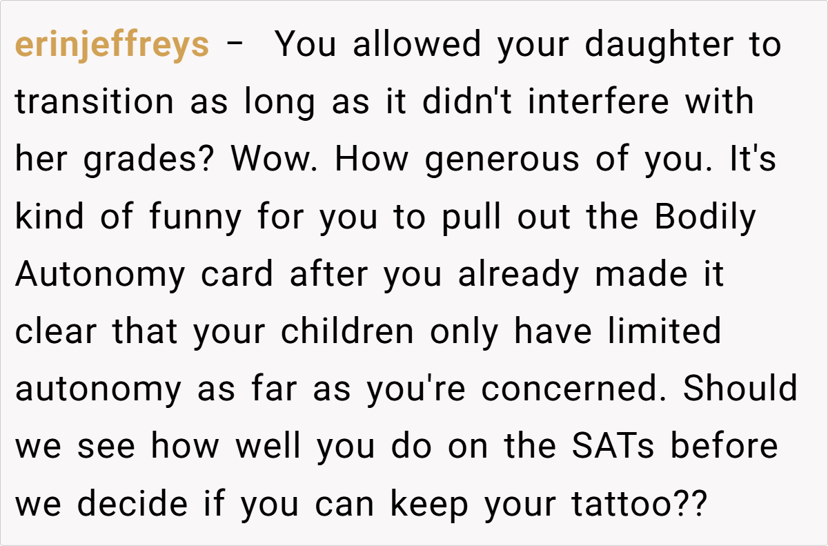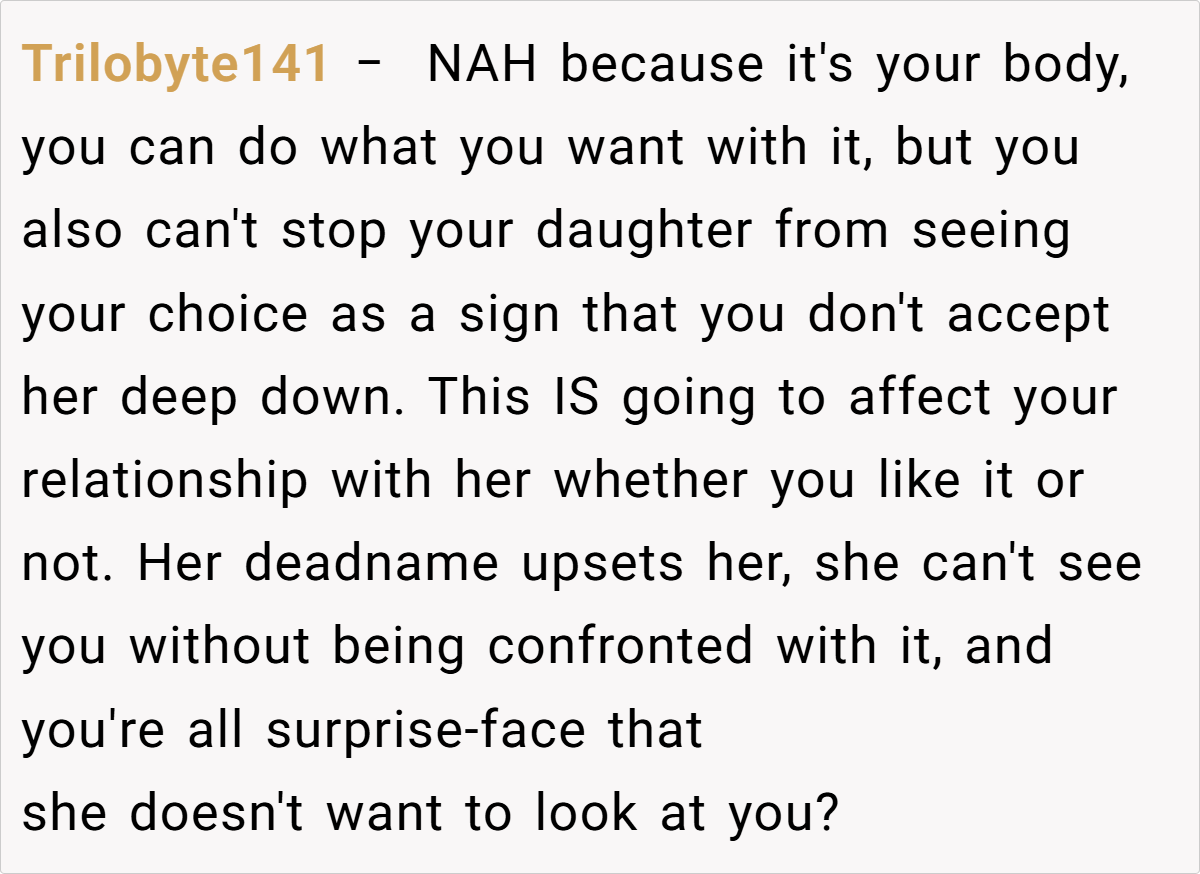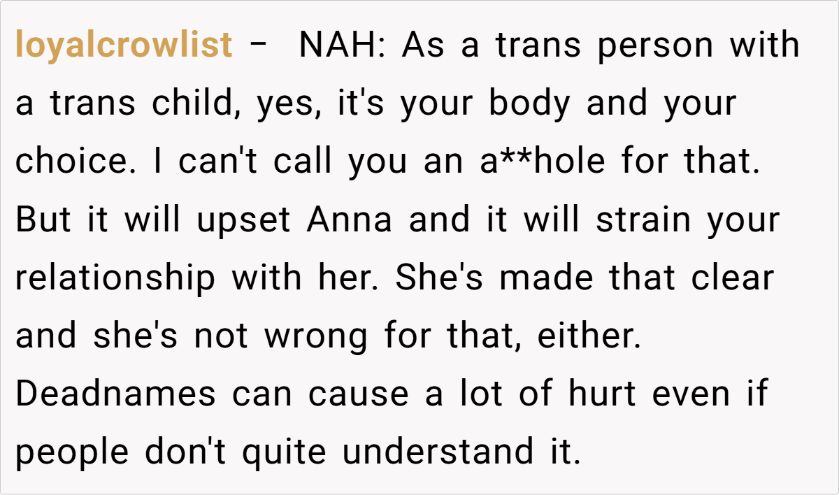 Reddit users have shared a wide range of perspectives on this sensitive issue. Some believe that respecting a transgender child’s identity should take precedence over personal preferences, while others stress that bodily autonomy is a valid right—even if it comes with emotional costs. The discussion is a vivid reminder that decisions in family life are rarely black and white, with each choice bearing its own set of consequences.