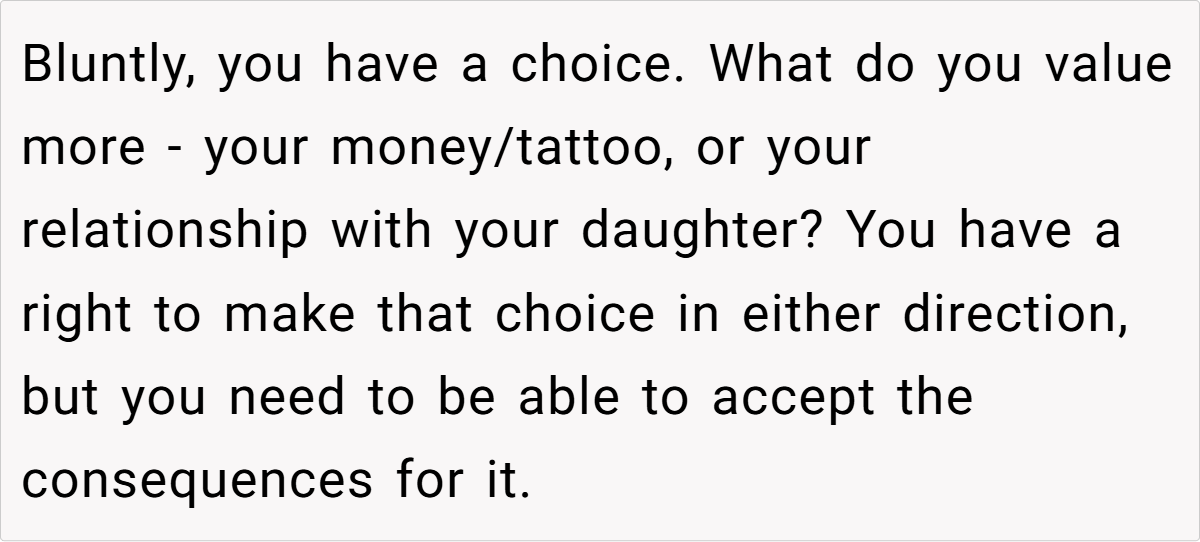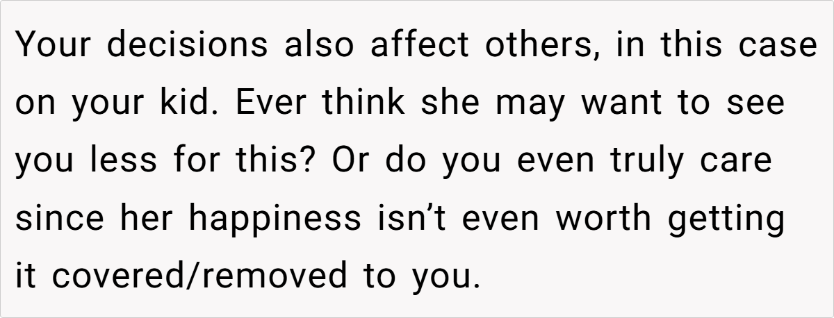 In conclusion, this story is a potent example of how deeply personal choices can have unexpected ramifications on loved ones. While the mother stands by her decision as an expression of personal freedom, the hurt it causes her daughter raises important questions about support, acceptance, and the responsibilities of parenting.