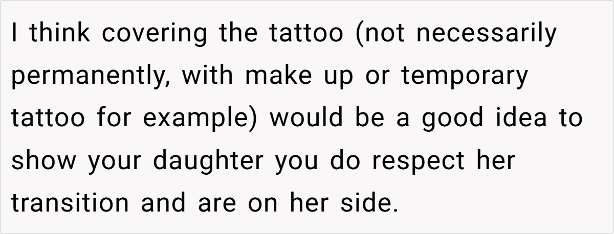 A potential compromise, such as a temporary cover-up or creative modification of the tattoo, might serve as a middle ground. This approach can help honor the mom’s past while showing tangible support for her daughter’s transition, ultimately fostering a healthier family dynamic.