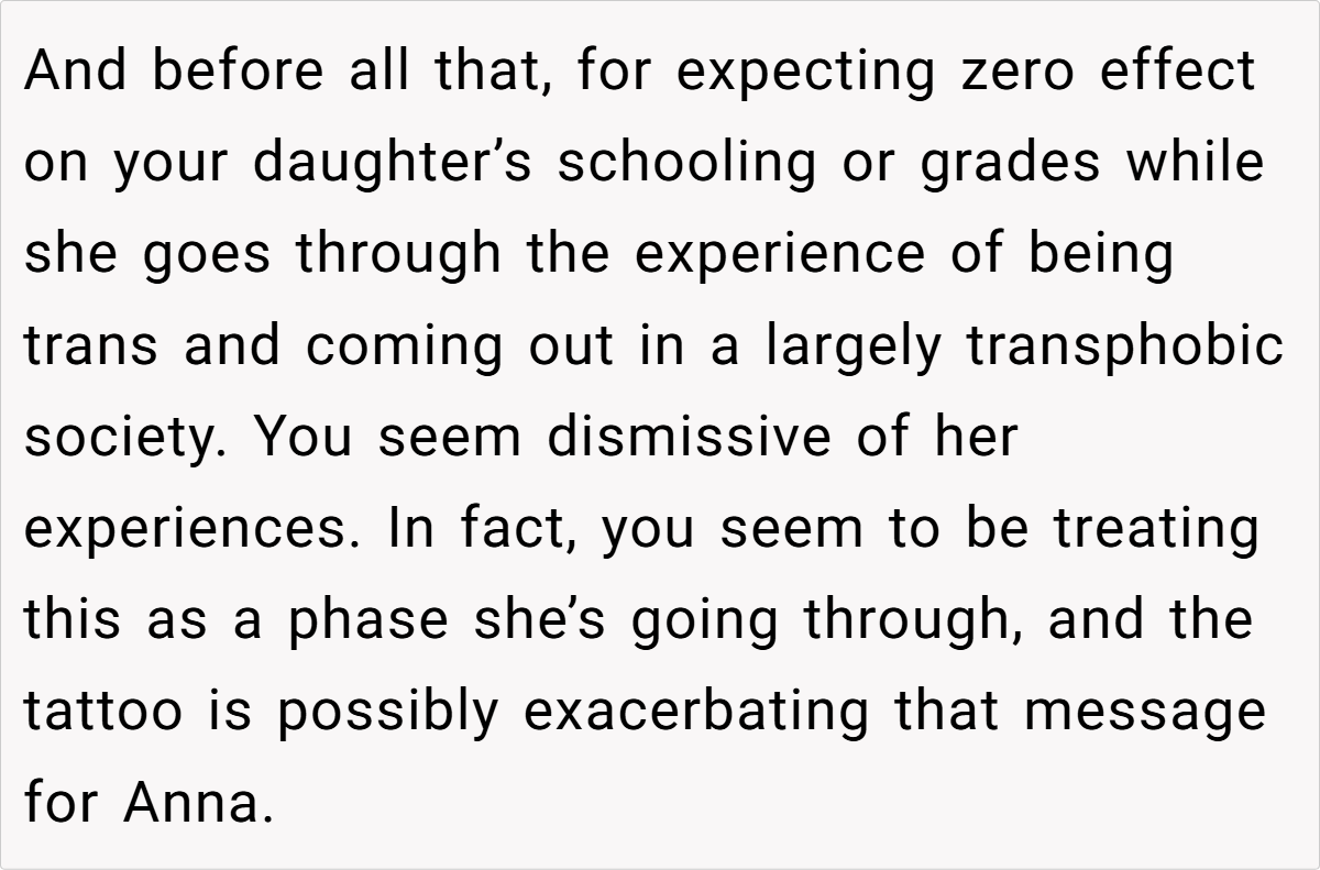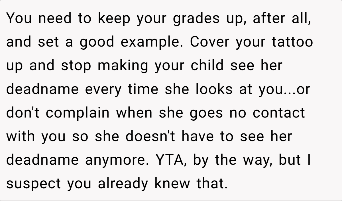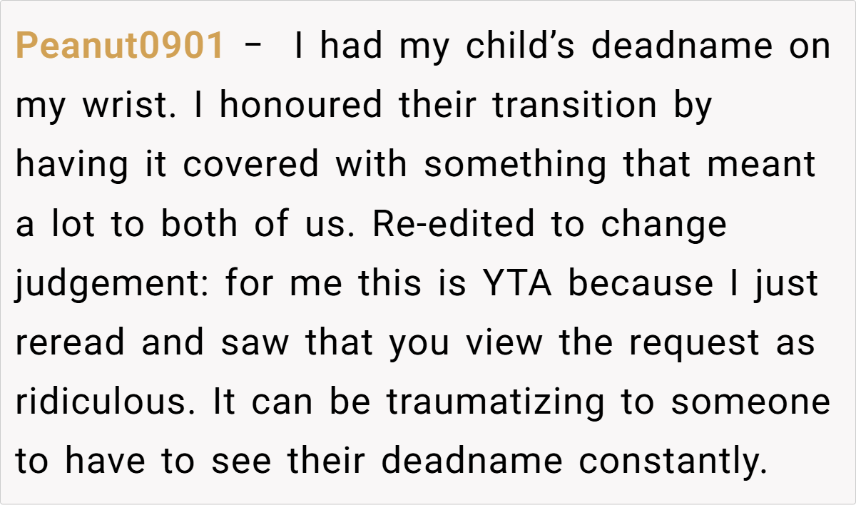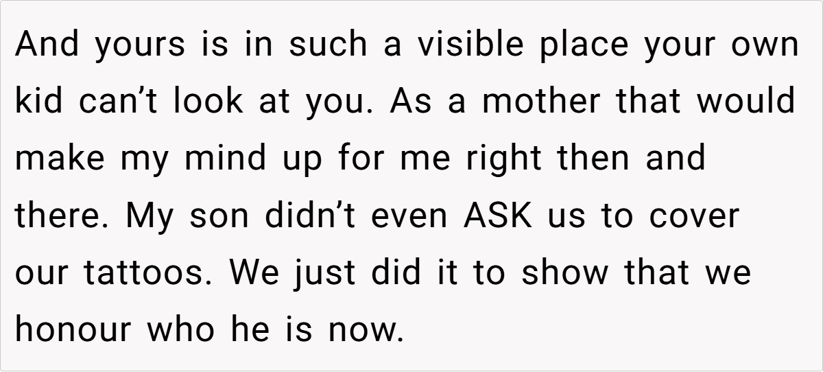 Family therapists also point out that visible symbols, like tattoos, can unintentionally serve as constant reminders of an identity that a child is actively trying to move away from. While the tattoo may hold sentimental value for the mom, its persistent presence may contribute to daily emotional distress for her daughter.