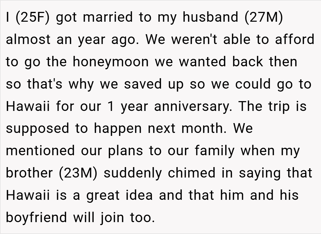 a 25-year-old bride was taken aback when her 23-year-old brother, along with his boyfriend, insisted on joining the celebration. Rather than enjoy a secluded, romantic retreat, she now faces the prospect of sharing her once-in-a-lifetime honeymoon experience with uninvited guests.