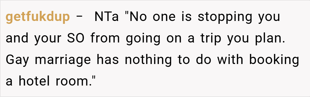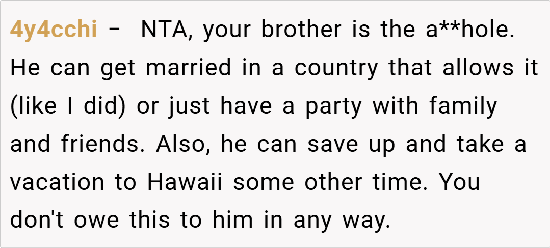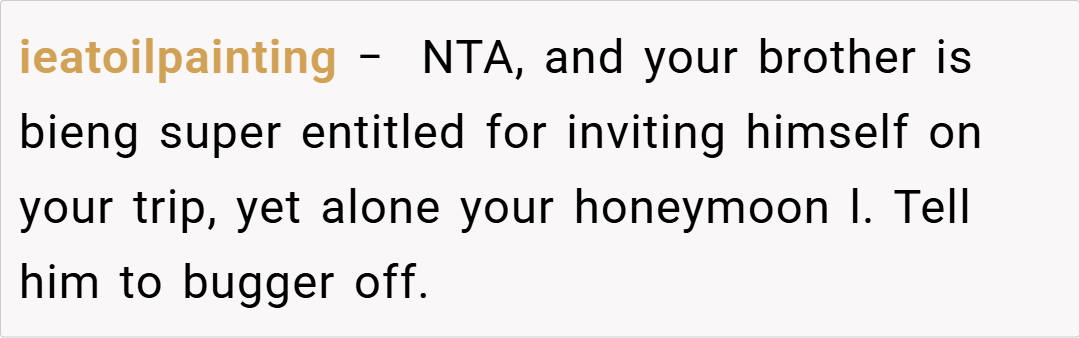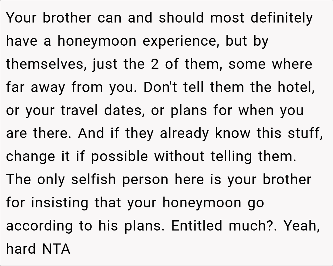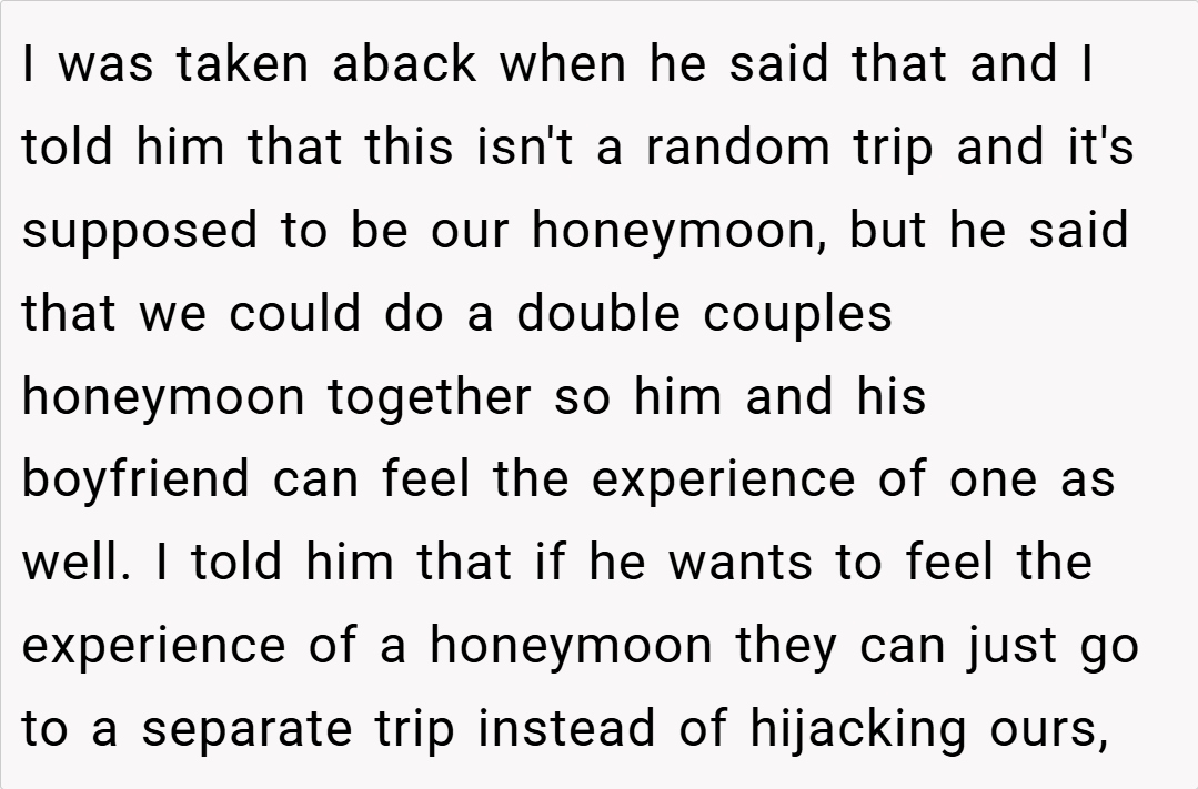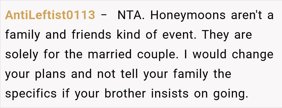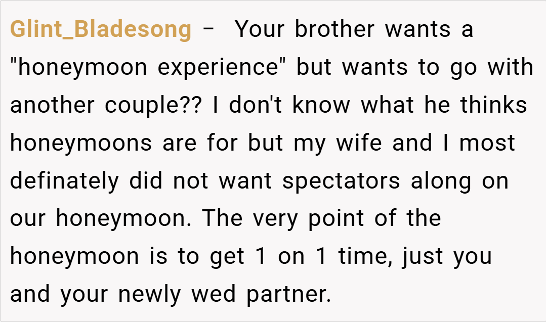 Here are some hot takes from the Reddit community—candid and unfiltered. One redditor exclaimed, “Honeymoons are 100% couple time—no room for spectators!” Another commented, “Your brother’s idea of a ‘double couples honeymoon’ is just his way of being entitled.