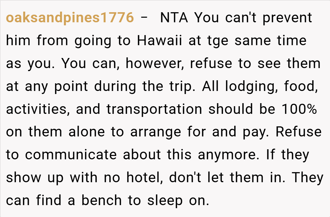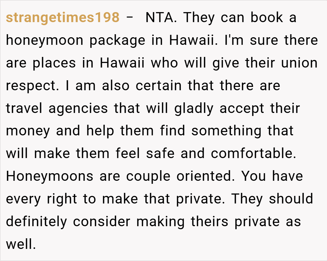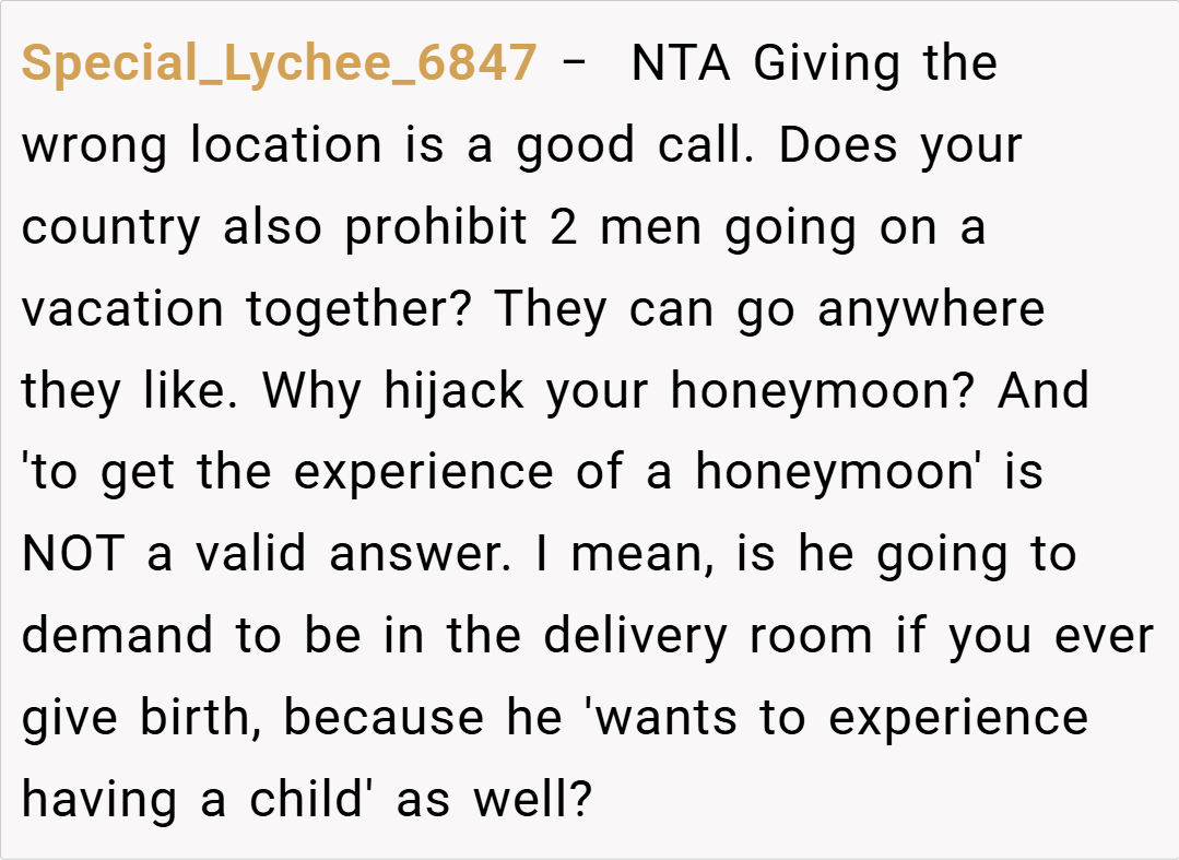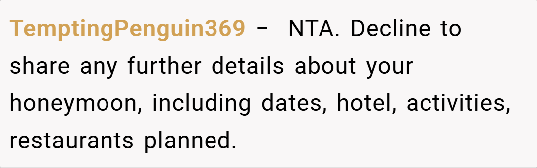 Your privacy matters.” A third user noted, “If he wants his own honeymoon experience, he should plan one for himself—your trip is not up for negotiation.” Yet another summed it up: “It’s all about setting boundaries. Your honeymoon is yours and your husband’s alone. NTA all the way.”