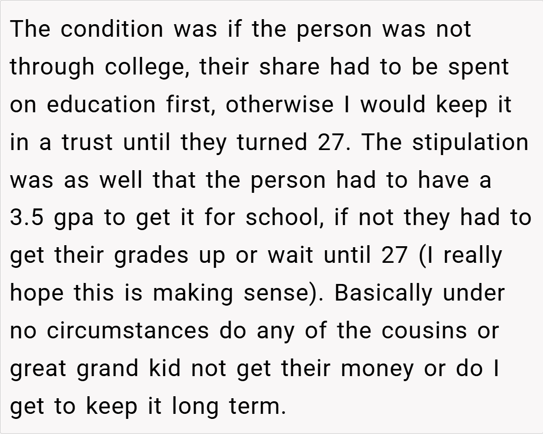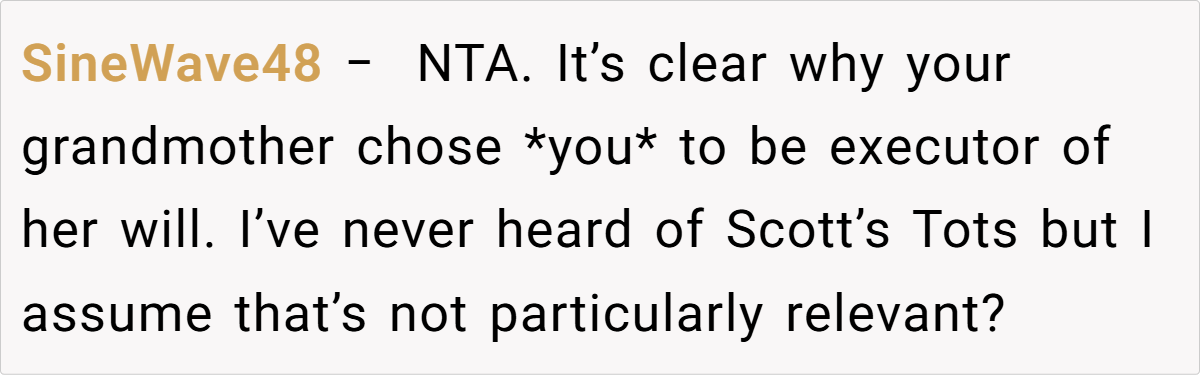 Ultimately, OP’s refusal to split her inheritance stems from a place of self-preservation and a history of family dysfunction. While her relatives may feel entitled to a share, legally and ethically the money was entrusted to her alone. Is it fair for OP to keep her inheritance if there was no prior agreement to share it,