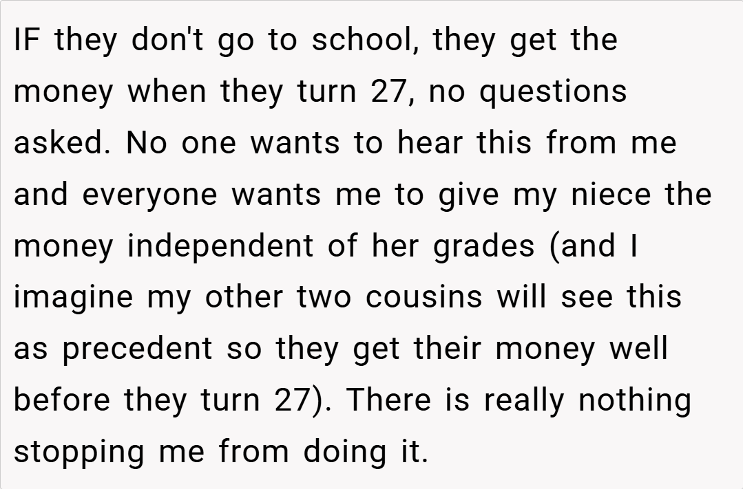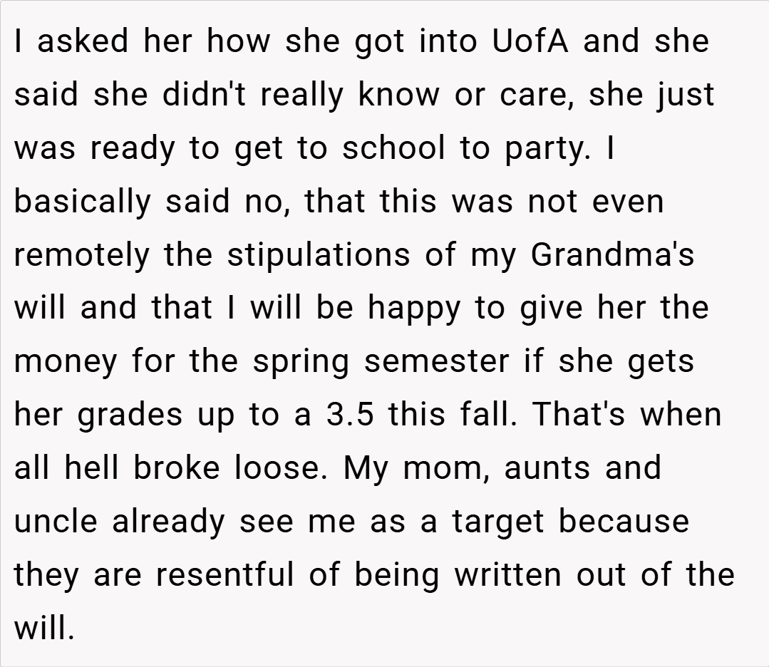The background is complex: her grandfather, who was never a warm presence, left everything to her despite the strained relationships within the family. Her father, an alcoholic who squandered what little praise he got from his own father, her older brother—favored and wasteful—and her younger sister (whom OP has promised to support for college once she turns 18) all now claim that the money “should” be shared.