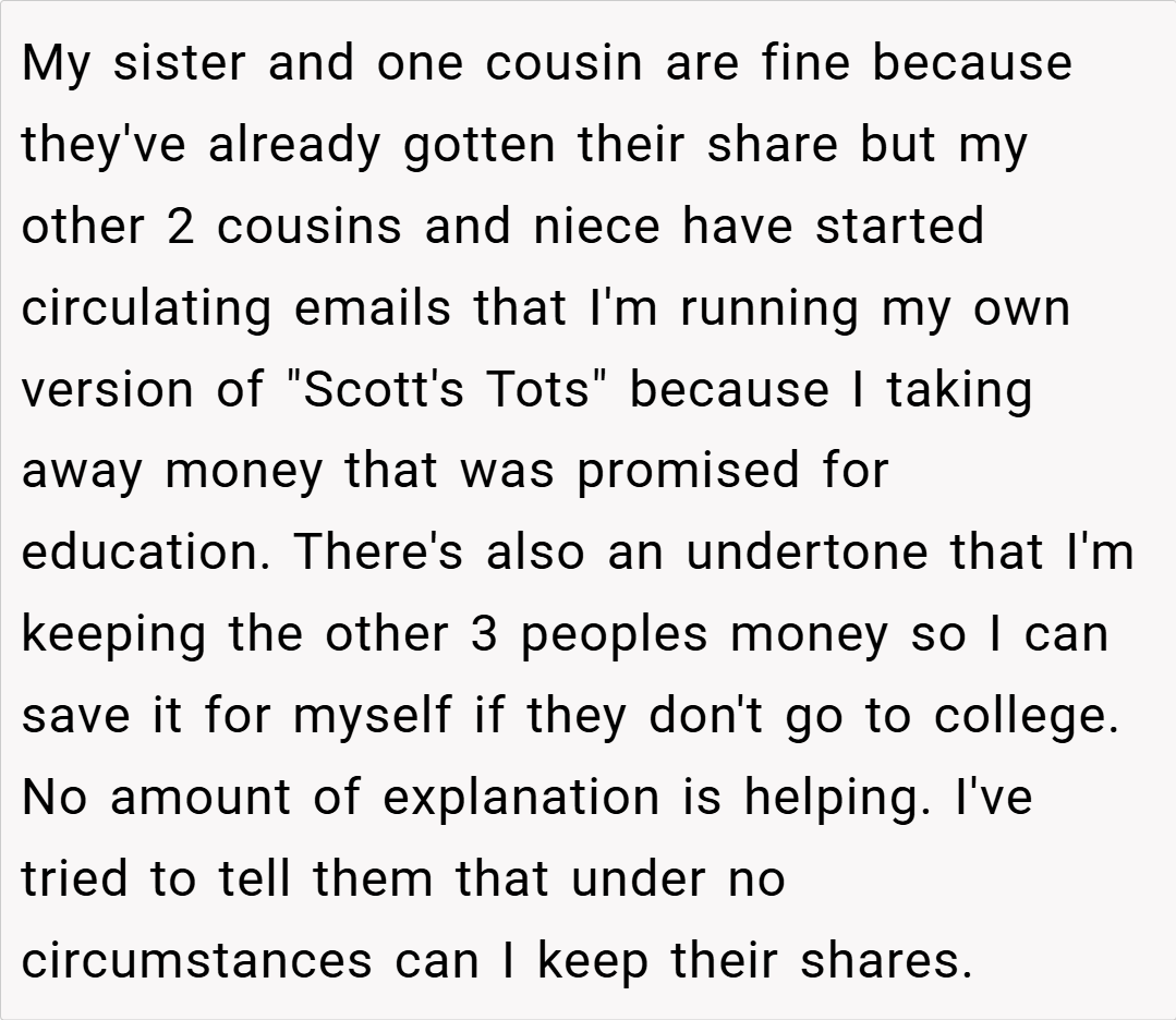 ‘ AITA for not allowing my niece to use “promised” money from my grandma’s estate to go to college? My family is derisively calling me “Scott’s Tots” in order to get me to bend and give in, and it’s sort of working.’