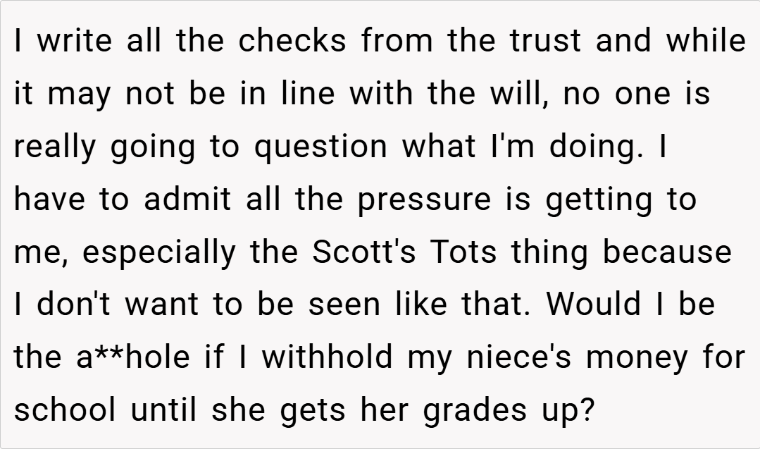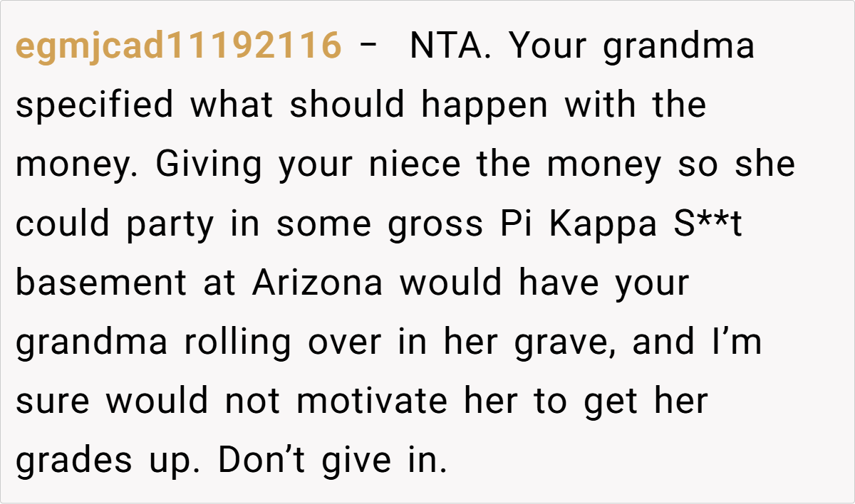AITA for not allowing my niece to use “promised” money from my grandma’s estate to go to college? My family is derisively calling me “Scott’s Tots” in order to get me to bend and give in, and it’s sort of working.