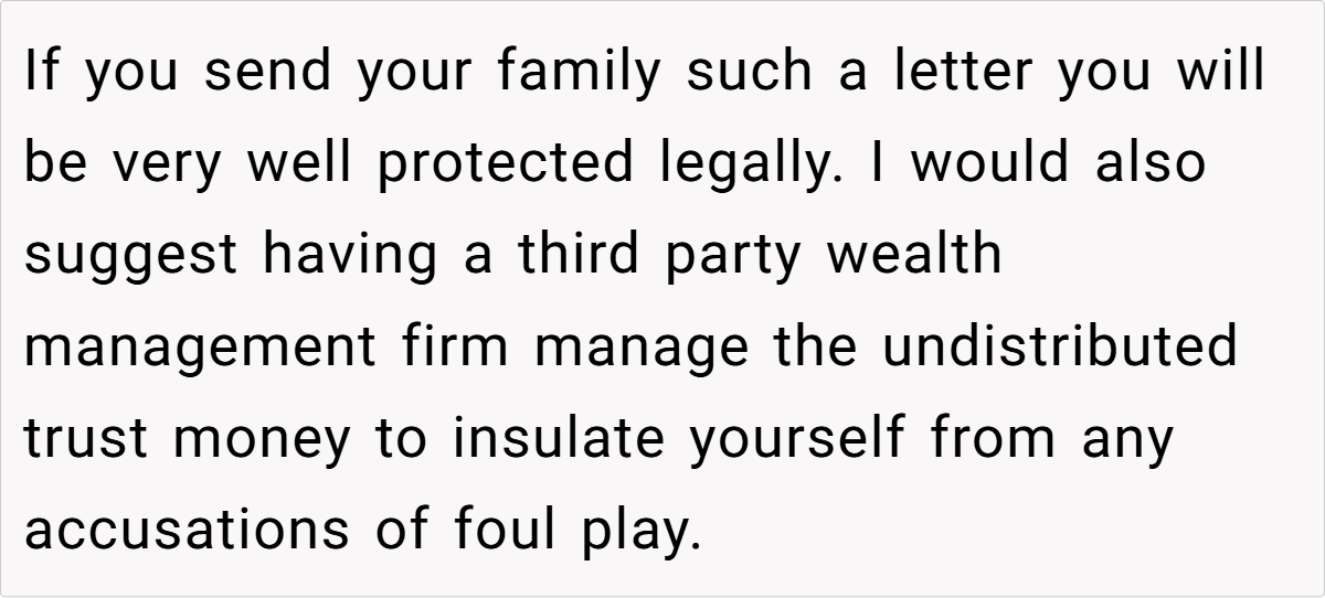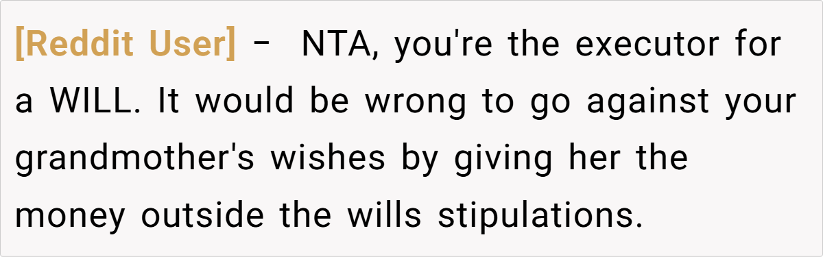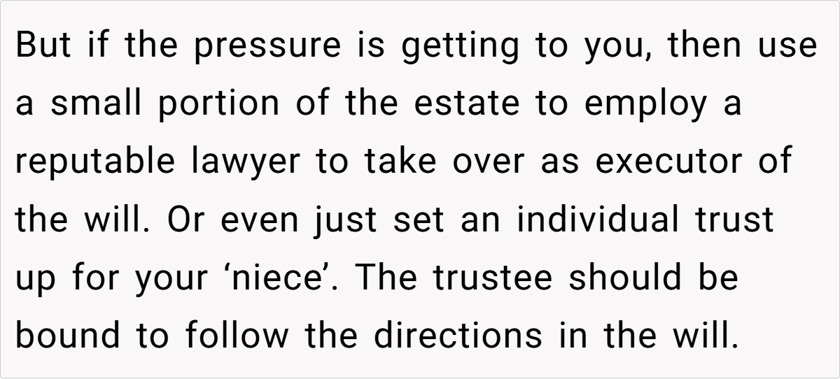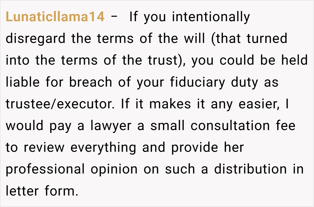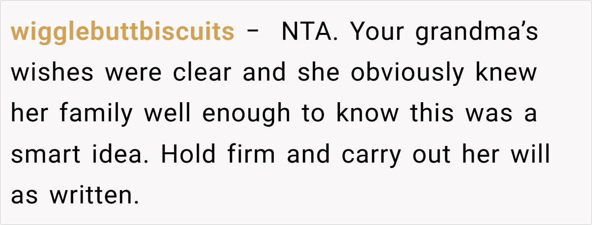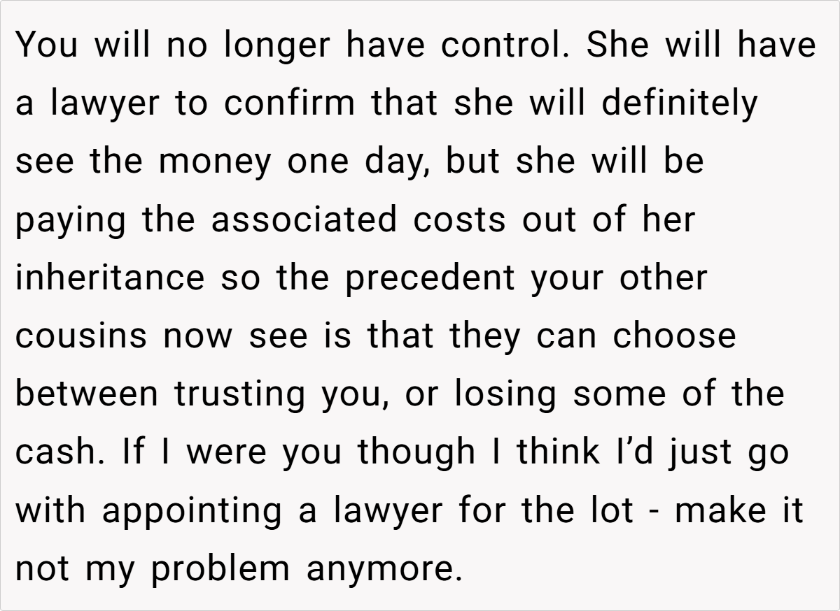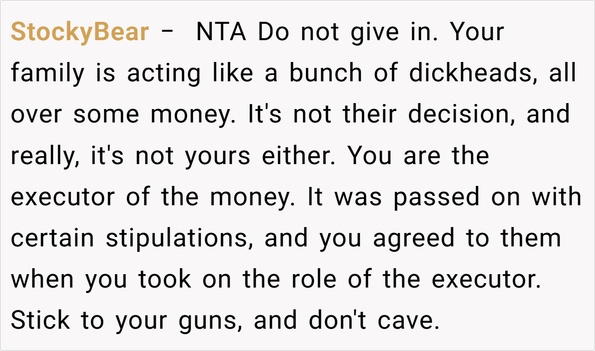 Clear communication about boundaries—preferably with the help of a mediator—might alleviate some of the tension, but it’s ultimately up to OP to decide how to manage her inheritance.” Both experts agree that while the emotional side of inheritance disputes is complex, legally and morally OP is justified in keeping the money if that is what she has been entrusted with, especially if there was no prior agreement to share it.