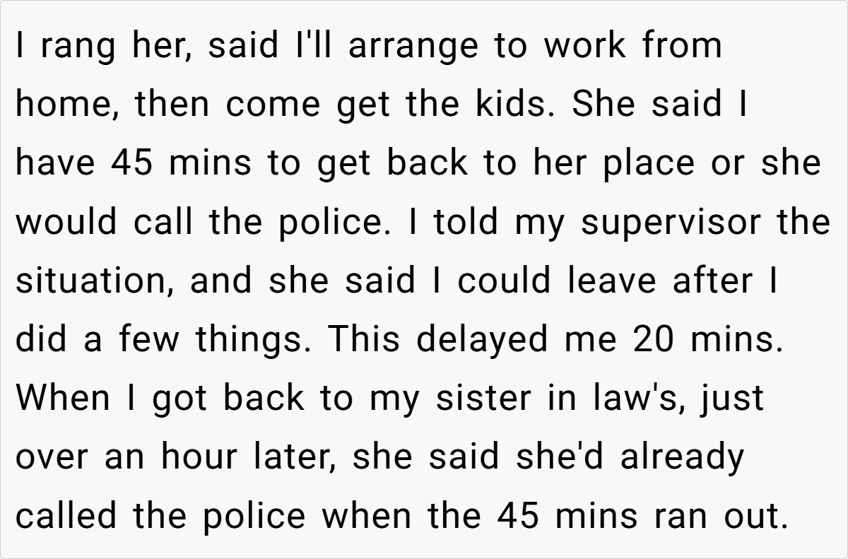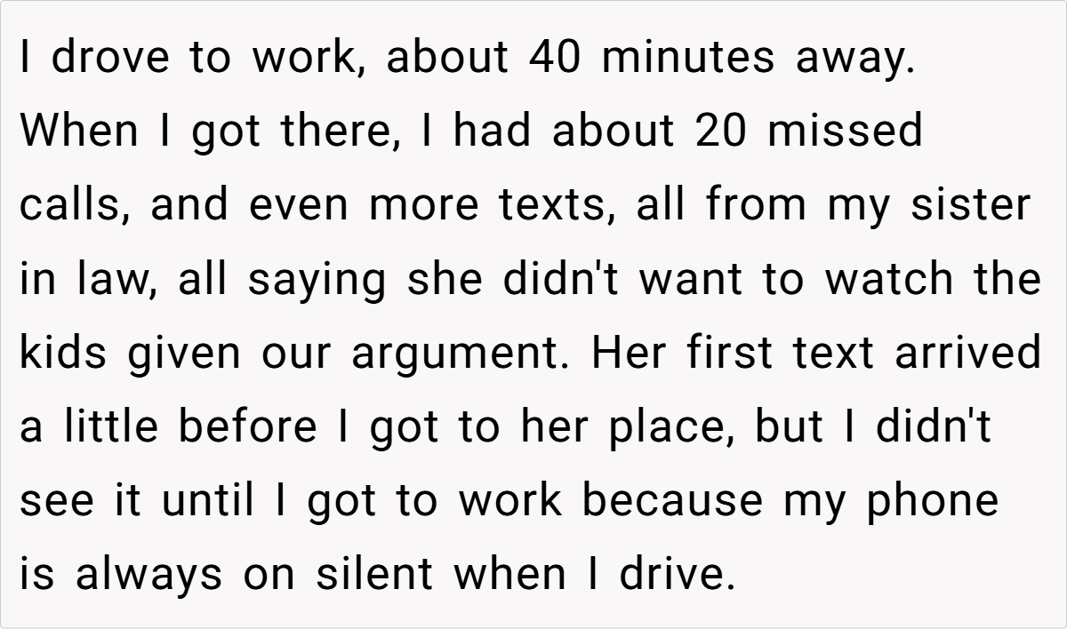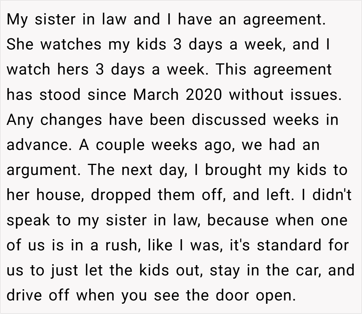 The OP explains that she has been exchanging babysitting duties with her sister-in-law since March 2020, a mutually beneficial arrangement that had worked well until a recent argument. After dropping her children off at her sister-in-law’s house, the OP received a barrage of missed calls and texts expressing her sister-in-law’s refusal to babysit due to their disagreement. Unable to check her phone while driving, the OP arrived an hour later only to learn that her sister-in-law had called the police, claiming she had abandoned the children.
