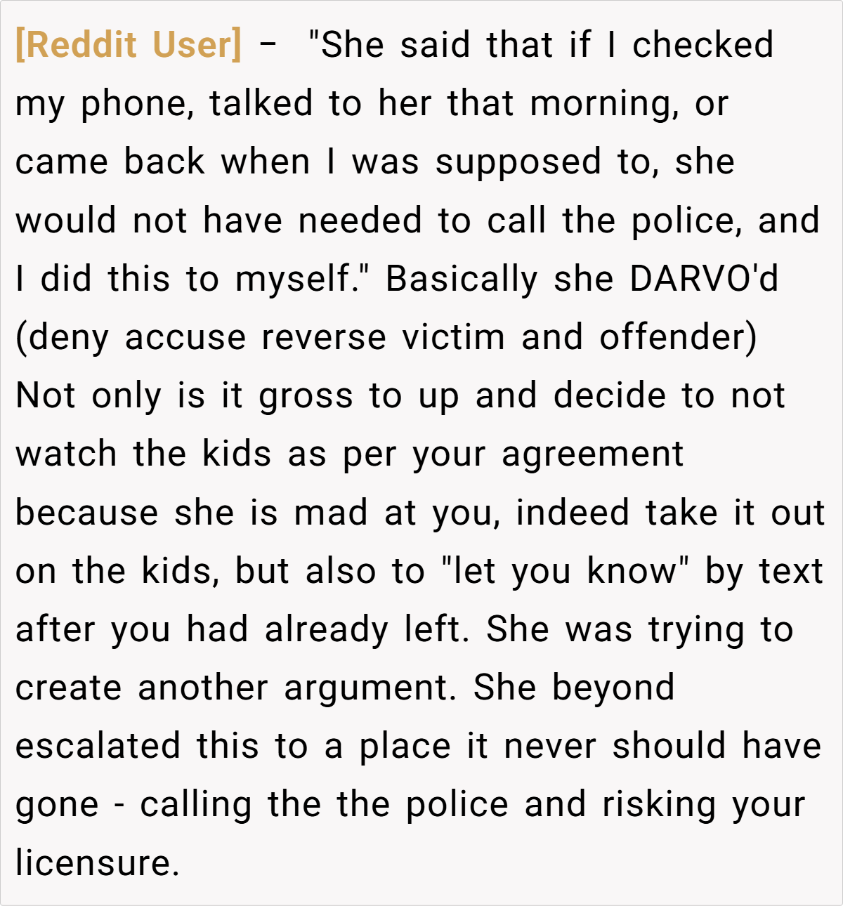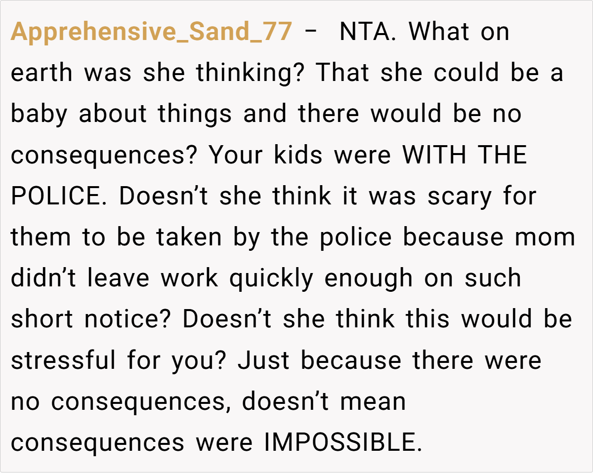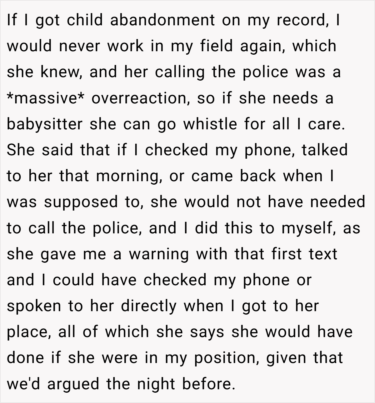 The OP explains that she has been exchanging babysitting duties with her sister-in-law since March 2020, a mutually beneficial arrangement that had worked well until a recent argument. After dropping her children off at her sister-in-law’s house, the OP received a barrage of missed calls and texts expressing her sister-in-law’s refusal to babysit due to their disagreement. Unable to check her phone while driving, the OP arrived an hour later only to learn that her sister-in-law had called the police, claiming she had abandoned the children.