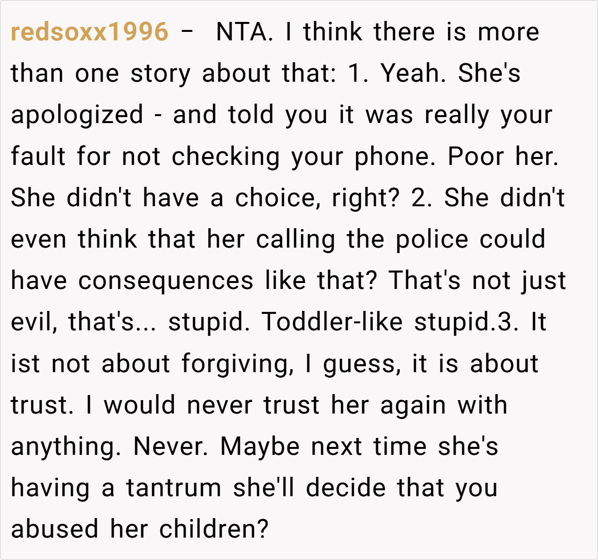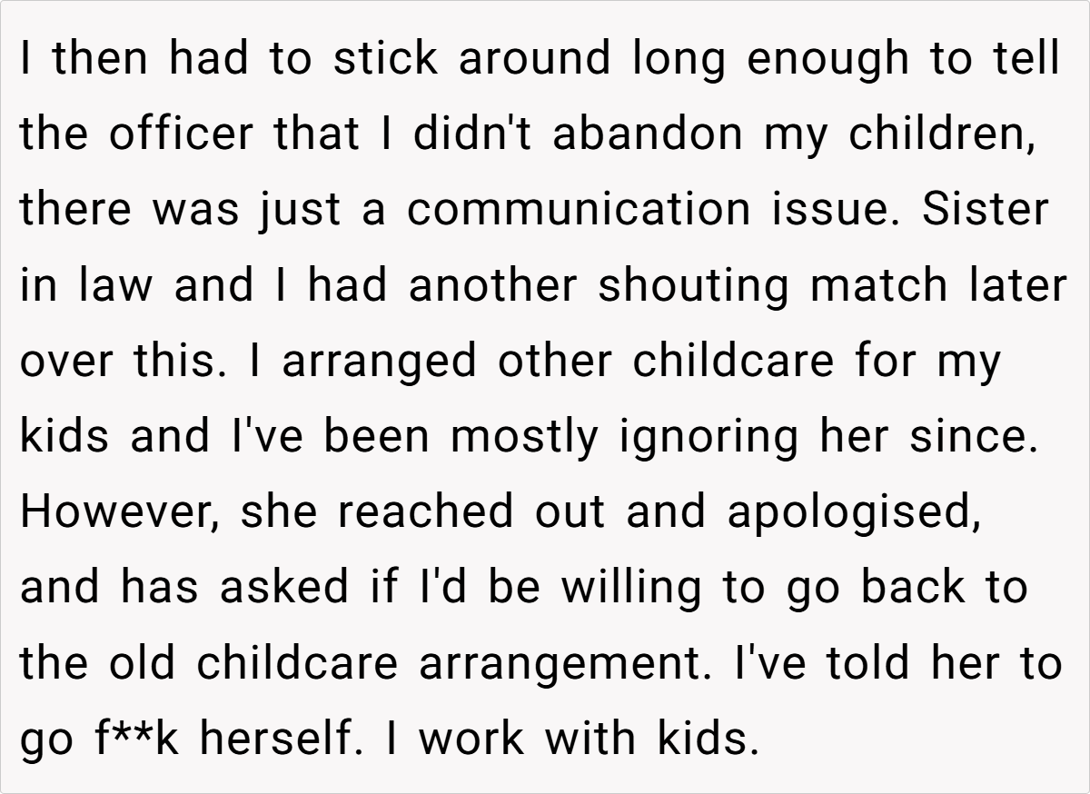 After clarifying the situation with the police, the OP felt betrayed and decided to arrange alternative childcare. Although her sister-in-law later apologized and asked to return to their previous arrangement, the OP firmly declined, citing the serious implications of her actions.