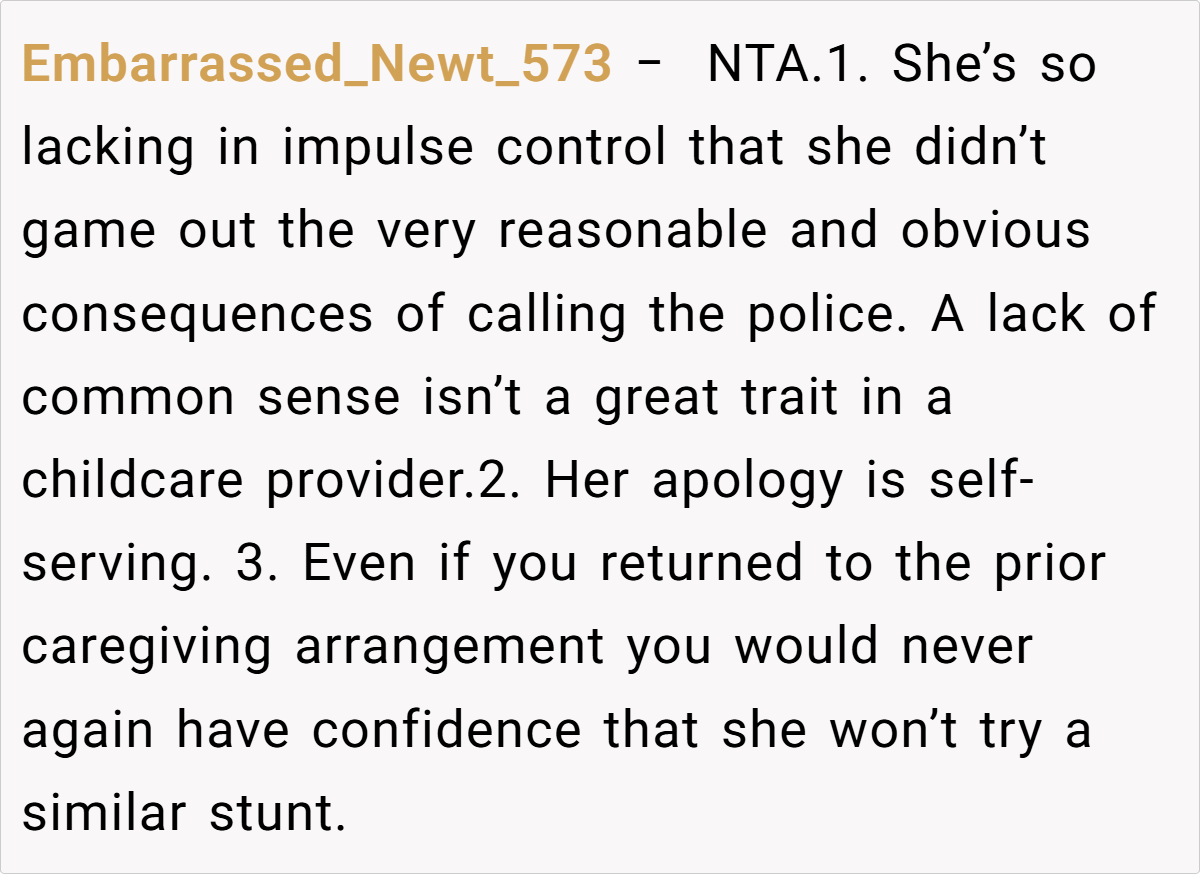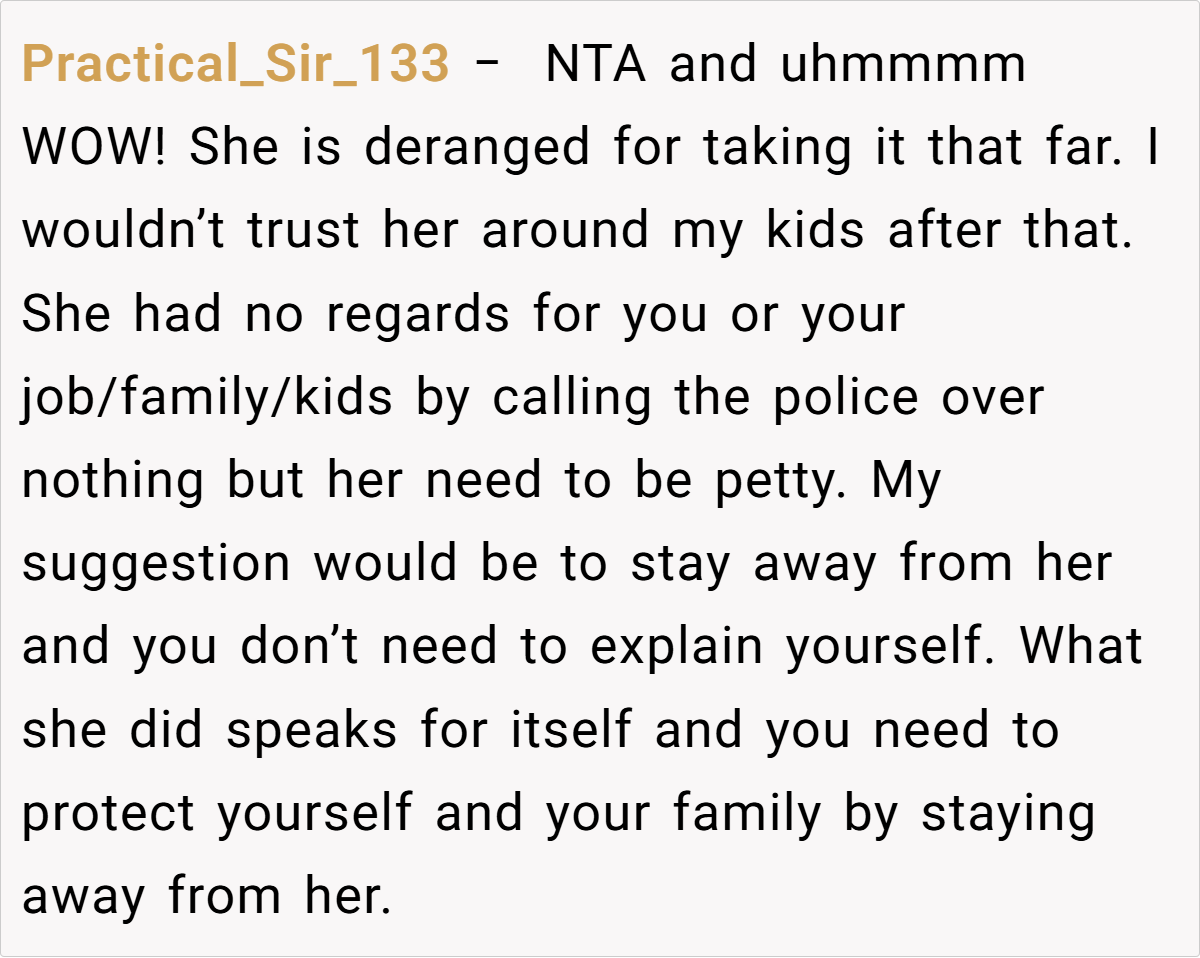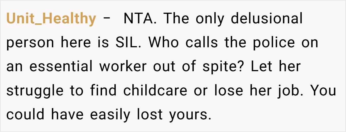 In a tense family dynamic, a woman finds herself questioning her decision to cut ties with her sister-in-law after a serious misunderstanding that escalated to calling the police. The OP and her sister-in-law had a longstanding childcare arrangement, but a recent argument led to a breakdown in communication and an extreme reaction that put the OP’s career at risk.