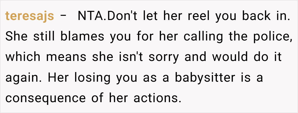 The situation raises significant issues surrounding trust and responsibility in family relationships. According to family therapist Dr. Karen McCoy, “Trust is foundational in any relationship, especially when it involves caring for children. The action of calling the police in this context not only breaches that trust but also puts unnecessary stress on everyone involved.”