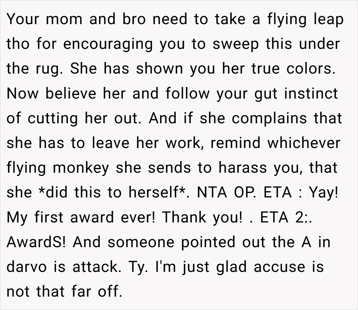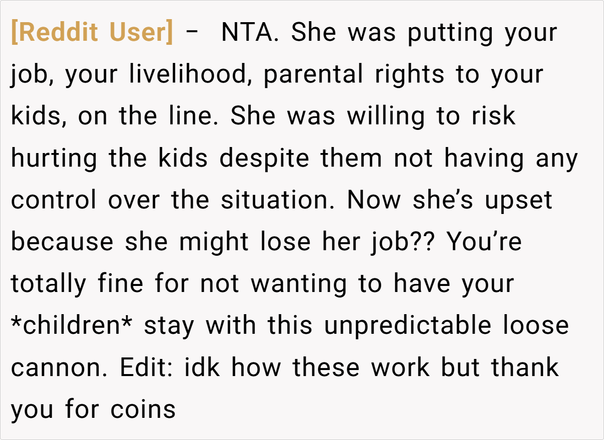 The community largely supports the OP, recognizing that her sister-in-law’s actions were extreme and unjustified. Many commenters agree that the OP has every right to set boundaries and prioritize her own family’s safety and well-being.